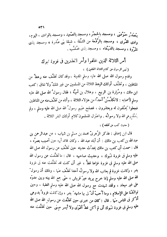 وَقَدِمَ رَسُولُ اللَّهِ صَلَّى اللهُ عَلَيْهِ وَسَلَّمَ الْمَدِينَةَ، وَقَدْ كَانَ تَخَلَّفَ عَنْهُ رَهْطٌ مِنْ الْمُنَافِقِينَ، وَتَخَلَّفَ أُولَئِكَ الرَّهْطُ الثَّلَاثَةُ مِنْ الْمُسْلِمِينَ مِنْ غَيْرِ شَكٍّ وَلَا نِفَاقٍ: كَعْبُ ابْن مَالِكٍ، وَمُرَارَةُ بْنُ الرَّبِيعِ، وَهِلَالُ بْنُ أُمَيَّةَ، فَقَالَ رَسُولُ اللَّهِ صَلَّى اللهُ عَلَيْهِ وَسَلَّمَ لِأَصْحَابِهِ: لَا تُكَلِّمُنَّ أَحَدًا مِنْ هَؤُلَاءِ الثَّلَاثَةِ، وَأَتَاهُ مَنْ تَخَلَّفَ عَنْهُ مِنْ الْمُنَافِقِينَ فَجَعَلُوا يَحْلِفُونَ لَهُ وَيَعْتَذِرُونَ، فَصَفَحَ عَنْهُمْ رَسُولُ اللَّهِ صَلَّى اللهُ عَلَيْهِ وَسَلَّمَ، وَلَمْ يَعْذِرْهُمْ اللَّهُ وَلَا رَسُولُهُ. وَاعْتَزَلَ الْمُسْلِمُونَ كَلَامَ أُولَئِكَ النَّفَرِ الثَّلَاثَةِ.