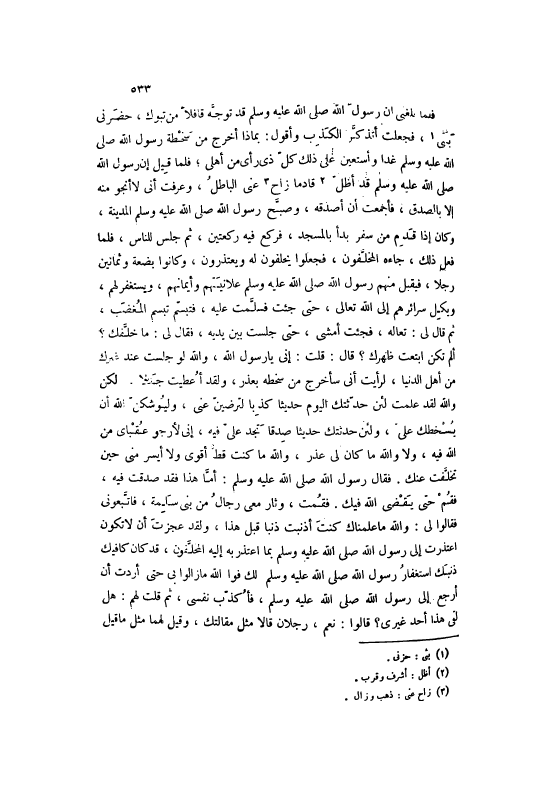 فَلَمَّا بَلَغَنِي أَنَّ رَسُولَ اللَّهِ صَلَّى اللهُ عَلَيْهِ وَسَلَّمَ قَدْ تَوَجَّهَ قَافِلًا مِنْ تَبُوكَ، حَضَرَنِي بَثِّي [1] ، فَجَعَلْتُ أَتَذَكَّرُ الْكَذِب وَأَقُول: بِمَاذَا أَخْرُجُ مِنْ سَخْطَةِ رَسُولِ اللَّهِ صَلَّى اللهُ عَلَيْهِ وَسَلَّمَ غَدًا وَأَسْتَعِينُ عَلَى ذَلِكَ كُلَّ ذِي رَأْيٍ مِنْ أَهْلِي، فَلَمَّا قِيلَ إنَّ رَسُولَ اللَّهِ صَلَّى اللهُ عَلَيْهِ وَسَلَّمَ قَدْ أَظَلَّ [2] قَادِمًا زَاحَ [3] عَنِّي الْبَاطِلُ، وَعَرَفْتُ أَنِّي لَا أَنْجُو مِنْهُ إلَّا بِالصِّدْقِ، فَأَجْمَعْتُ أَنْ أَصْدُقَهُ، وَصَبَّحَ رَسُولُ اللَّهِ صَلَّى اللهُ عَلَيْهِ وَسَلَّمَ الْمَدِينَةَ، وَكَانَ إذَا قَدِمَ مِنْ سَفَرٍ بَدَأَ بِالْمَسْجِدِ، فَرَكَعَ فِيهِ رَكْعَتَيْنِ، ثُمَّ جَلَسَ لِلنَّاسِ، فَلَمَّا فَعَلَ ذَلِكَ، جَاءَهُ الْمُخَلِّفُونَ، فَجَعَلُوا يَحْلِفُونَ لَهُ وَيَعْتَذِرُونَ، وَكَانُوا بِضْعَةً وَثَمَانِينَ رَجُلًا، فَيَقْبَلُ مِنْهُمْ رَسُولُ اللَّهِ صَلَّى اللهُ عَلَيْهِ وَسَلَّمَ عَلَانِيَتَهُمْ وَأَيْمَانَهُمْ، وَيَسْتَغْفِرُ لَهُمْ، وَيَكِلُ سَرَائِرَهُمْ إلَى اللَّهِ تَعَالَى، حَتَّى جِئْتُ فَسَلَّمْتُ عَلَيْهِ، فَتَبَسَّمَ تَبَسُّمَ الْمُغْضَبِ، ثُمَّ قَالَ لِي: تَعَالَهْ، فَجِئْتُ أَمْشِي، حَتَّى جَلَسْتُ بَيْنَ يَدَيْهِ، فَقَالَ لِي: مَا خَلَّفَكَ؟