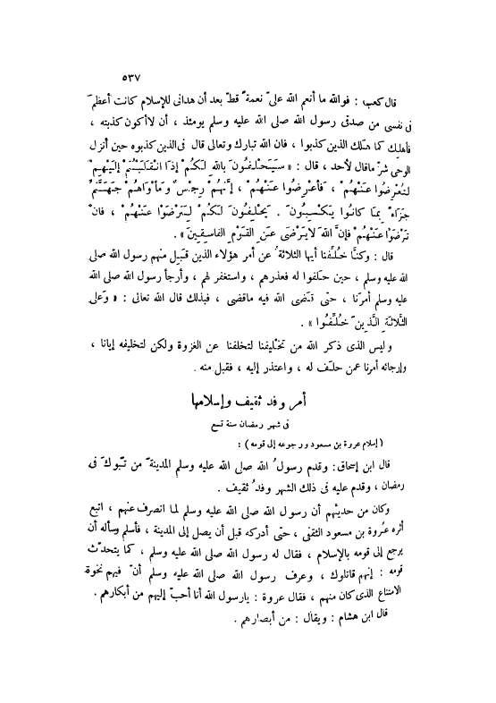 قَالَ ابْنُ إسْحَاقَ: وَقَدِمَ رَسُولُ اللَّهِ صَلَّى اللهُ عَلَيْهِ وَسَلَّمَ الْمَدِينَةَ مِنْ تَبُوكَ فِي رَمَضَانَ، وَقَدِمَ عَلَيْهِ فِي ذَلِكَ الشَّهْرِ وَفْدُ ثَقِيفٍ.