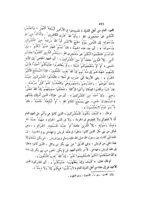 الْعَهْدِ الْعَامِّ مِنْ أَهْلِ الشِّرْكِ فَسِيحُوا فِي الْأَرْضِ أَرْبَعَةَ أَشْهُرٍ، وَاعْلَمُوا أَنَّكُمْ غَيْرُ مُعْجِزِي اللَّهِ، وَأَنَّ اللَّهَ مُخْزِي الْكافِرِينَ. وَأَذانٌ مِنَ اللَّهِ وَرَسُولِهِ إِلَى النَّاسِ يَوْمَ الْحَجِّ الْأَكْبَرِ أَنَّ اللَّهَ بَرِيءٌ مِنَ الْمُشْرِكِينَ وَرَسُولُهُ 9: 2- 3: أَيْ بَعْدَ هَذِهِ الْحِجَّةِ فَإِنْ تُبْتُمْ فَهُوَ خَيْرٌ لَكُمْ، وَإِنْ تَوَلَّيْتُمْ فَاعْلَمُوا أَنَّكُمْ غَيْرُ مُعْجِزِي اللَّهِ، وَبَشِّرِ الَّذِينَ كَفَرُوا بِعَذابٍ أَلِيمٍ. إِلَّا الَّذِينَ عاهَدْتُمْ مِنَ الْمُشْرِكِينَ 9: 3- 4: أَيْ الْعَهْدَ الْخَاصَّ إلَى الْأَجَلِ الْمُسَمَّى ثُمَّ لَمْ يَنْقُصُوكُمْ شَيْئاً، وَلَمْ يُظاهِرُوا عَلَيْكُمْ أَحَداً فَأَتِمُّوا إِلَيْهِمْ عَهْدَهُمْ إِلى مُدَّتِهِمْ إِنَّ اللَّهَ يُحِبُّ الْمُتَّقِينَ، فَإِذَا انْسَلَخَ الْأَشْهُرُ الْحُرُمُ 9: 4- 5: يَعْنِي الْأَرْبَعَةَ الَّتِي ضَرَبَ لَهُمْ أَجَلًا فَاقْتُلُوا الْمُشْرِكِينَ حَيْثُ وَجَدْتُمُوهُمْ، وَخُذُوهُمْ وَاحْصُرُوهُمْ وَاقْعُدُوا لَهُمْ كُلَّ مَرْصَدٍ، فَإِنْ تابُوا وَأَقامُوا الصَّلاةَ وَآتَوُا الزَّكاةَ، فَخَلُّوا سَبِيلَهُمْ إِنَّ اللَّهَ غَفُورٌ رَحِيمٌ. وَإِنْ أَحَدٌ مِنَ الْمُشْرِكِينَ 9: 5- 6: أَيْ مِنْ هَؤُلَاءِ الَّذِينَ أَمَرْتُكَ بِقَتْلِهِمْ اسْتَجارَكَ فَأَجِرْهُ حَتَّى يَسْمَعَ كَلامَ اللَّهِ، ثُمَّ أَبْلِغْهُ مَأْمَنَهُ، ذلِكَ بِأَنَّهُمْ قَوْمٌ لَا يَعْلَمُونَ 9: 6.