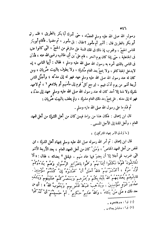 رَسُولِ اللَّهِ صَلَّى اللهُ عَلَيْهِ وَسَلَّمَ الْعَضْبَاءَ، حَتَّى أَدْرَكَ أَبَا بَكْرٍ بِالطَّرِيقِ، فَلَمَّا رَآهُ أَبُو بَكْرٍ بِالطَّرِيقِ قَالَ: أَأَمِيرٌ أَمْ مَأْمُورٌ؟ فَقَالَ: بَلْ مَأْمُورٌ، ثُمَّ مَضَيَا. فَأَقَامَ أَبُو بَكْرٍ لِلنَّاسِ الْحَجَّ، وَالْعَرَبُ إذْ ذَاكَ فِي تِلْكَ السَّنَةِ عَلَى مَنَازِلِهِمْ مِنْ الْحَجِّ، الَّتِي كَانُوا عَلَيْهَا فِي الْجَاهِلِيَّةِ، حَتَّى إذَا كَانَ يَوْمُ النَّحْرِ، قَامَ عَلِيُّ بْنُ أَبِي طَالِبٍ رَضِيَ اللَّهُ عَنْهُ، فَأَذَّنَ فِي النَّاسِ بِاَلَّذِي أَمَرَهُ بِهِ رَسُولُ اللَّهِ صَلَّى اللهُ عَلَيْهِ وَسَلَّمَ، فَقَالَ: أَيُّهَا النَّاسُ، إنَّهُ لَا يَدْخُلُ الْجَنَّةَ كَافِرٌ، وَلَا يَحُجُّ بَعْدَ الْعَامِ مُشْرِكٌ، وَلَا يطوف بِالْبَيْتِ عُرْيَان، وَمَنْ كَانَ لَهُ عِنْدَ رَسُولِ اللَّهِ صَلَّى اللهُ عَلَيْهِ وَسَلَّمَ عَهْدٌ فَهُوَ لَهُ إلَى مُدَّتِهِ، وَأَجَّلَ النَّاسَ أَرْبَعَةَ أَشْهُرٍ مِنْ يَوْمِ أَذَّنَ فِيهِمْ، لِيَرْجِعَ كُلُّ قَوْمٍ إلَى مَأْمَنِهِمْ أَوْ بِلَادِهِمْ [1] ، ثُمَّ لَا عَهْدٌ لِمُشْرِكِ وَلَا ذِمَّةٌ إلَّا أَحَدٌ كَانَ لَهُ عِنْدَ رَسُولِ اللَّهِ صَلَّى اللهُ عَلَيْهِ وَسَلَّمَ عَهْدٌ إلَى مُدَّةٍ، فَهُوَ لَهُ إلَى مُدَّتِهِ. فَلَمْ يَحُجَّ بَعْدَ ذَلِكَ الْعَامِ مُشْرِكٌ، وَلَمْ يَطُفْ بِالْبَيْتِ عُرْيَانٌ. ثُمَّ قَدِمَا عَلَى رَسُولِ اللَّهِ صَلَّى اللهُ عَلَيْهِ وَسَلَّمَ.