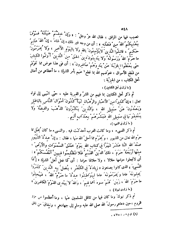 نُصِيبُ فِيهَا مِنْ الْمَرَافِقِ، فَقَالَ اللَّهُ عَزَّ وَجَلَّ: وَإِنْ خِفْتُمْ عَيْلَةً فَسَوْفَ يُغْنِيكُمُ اللَّهُ مِنْ فَضْلِهِ 9: 28: أَيْ مِنْ وَجْهٍ غَيْرِ ذَلِكَ إِنْ شاءَ، إِنَّ اللَّهَ عَلِيمٌ حَكِيمٌ، قاتِلُوا الَّذِينَ لَا يُؤْمِنُونَ بِاللَّهِ وَلا بِالْيَوْمِ الْآخِرِ، وَلا يُحَرِّمُونَ مَا حَرَّمَ اللَّهُ وَرَسُولُهُ وَلا يَدِينُونَ دِينَ الْحَقِّ مِنَ الَّذِينَ أُوتُوا الْكِتابَ حَتَّى يُعْطُوا الْجِزْيَةَ عَنْ يَدٍ وَهُمْ صاغِرُونَ 9: 28- 29: أَيْ فَفِي هَذَا عِوَضٌ مِمَّا تَخَوَّفْتُمْ مِنْ قَطْعِ الْأَسْوَاقِ، فَعَوَّضَهُمْ اللَّهُ بِمَا قَطَعَ [1] عَنْهُمْ بِأَمْرِ الشِّرْكِ، مَا أَعْطَاهُمْ مِنْ أَعْنَاقِ أَهْلِ الْكِتَابِ، مِنْ الْجِزْيَةِ.