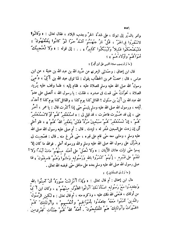 قَالَ ابْنُ إسْحَاقَ: وَحَدَّثَنِي الزُّهْرِيُّ عَنْ عُبَيْدِ اللَّهِ بْنِ عَبْدِ اللَّهِ بْنِ عُتْبَةَ، عَنْ ابْنِ عَبَّاسٍ، قَالَ: سَمِعْتُ عُمَرَ بْنَ الْخَطَّابِ يَقُولُ: لَمَّا تُوُفِّيَ عَبْدُ اللَّهِ بْنُ أَبَيٍّ، دُعِيَ رَسُولُ اللَّهِ صَلَّى اللهُ عَلَيْهِ وَسَلَّمَ لِلصَّلَاةِ عَلَيْهِ، فَقَامَ إلَيْهِ، فَلَمَّا وَقَفَ عَلَيْهِ يُرِيدُ الصَّلَاةَ، تَحَوَّلْتُ حَتَّى قُمْتُ فِي صَدْرِهِ، فَقُلْتُ: يَا رَسُولَ اللَّهِ، أَتُصَلِّي عَلَى عَدُوِّ اللَّهِ عَبْدِ اللَّهِ بْنِ أَبَيٍّ بن سَلُولَ؟ الْقَائِلِ كَذَا يَوْمَ كَذَا، وَالْقَائِلِ كَذَا يَوْمَ كَذَا؟ أُعَدِّدُ أَيَّامَهُ، وَرَسُولُ اللَّهِ صَلَّى اللهُ عَلَيْهِ وَسَلَّمَ يَتَبَسَّمُ حَتَّى إذَا أَكْثَرْتُ قَالَ: يَا عُمَرُ، أَخِّرْ عَنِّي، إنِّي قَدْ خُيِّرْتُ فَاخْتَرْتُ، قَدْ قِيلَ لِي: اسْتَغْفِرْ لَهُمْ أَوْ لَا تَسْتَغْفِرْ لَهُمْ، إِنْ تَسْتَغْفِرْ لَهُمْ سَبْعِينَ مَرَّةً فَلَنْ يَغْفِرَ اللَّهُ لَهُمْ 9: 80، فَلَوْ أَعْلَمُ أَنِّي إنْ زِدْتُ عَلَى السَّبْعِينَ غُفِرَ لَهُ، لَزِدْتُ. قَالَ: ثُمَّ صلى الله عَلَيْهِ رَسُولُ اللَّهِ صَلَّى اللهُ عَلَيْهِ وَسَلَّمَ، وَمَشَى مَعَهُ حَتَّى قَامَ عَلَى قَبْرِهِ، حَتَّى فُرِغَ مِنْهُ. قَالَ: فَعَجِبْتُ لِي وَلِجُرْأَتِي عَلَى رَسُولِ اللَّهِ صَلَّى اللهُ عَلَيْهِ وَسَلَّمَ وَاَللَّهُ وَرَسُوله أعلم. فو الله مَا كَانَ إلَّا يَسِيرًا حَتَّى نَزَلَتْ هَاتَانِ الْآيَتَانِ: وَلا تُصَلِّ عَلى أَحَدٍ مِنْهُمْ ماتَ أَبَداً وَلا تَقُمْ عَلى قَبْرِهِ، إِنَّهُمْ كَفَرُوا بِاللَّهِ وَرَسُولِهِ وَماتُوا وَهُمْ فاسِقُونَ 9: 84 فَمَا صَلَّى رَسُولُ اللَّهِ صَلَّى اللهُ عَلَيْهِ وَسَلَّمَ بَعْدَهُ عَلَى مُنَافِقٍ حَتَّى قَبَضَهُ اللَّهُ تَعَالَى.