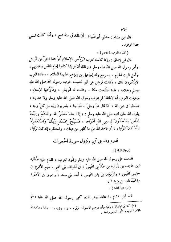 فَقَدِمَتْ عَلَى رَسُولِ اللَّهِ صَلَّى اللهُ عَلَيْهِ وَسَلَّمَ وُفُودُ الْعَرَبِ، فَقَدِمَ عَلَيْهِ عُطَارِدُ ابْن حَاجِبِ بْنِ زُرَارَةَ بْنِ عُدُسٍ التَّمِيمِيُّ، فِي أَشْرَافِ بَنِي تَمِيمٍ، مِنْهُمْ الْأَقْرَعُ بْنُ حَابِسٍ التَّمِيمِيُّ، وَالزِّبْرِقَانُ بْنُ بَدْرٍ التَّمِيمِيُّ، أَحَدُ بَنِي سَعْدٍ، وَعَمْرُو بْنُ الْأَهْتَمِ، وَالْحَبْحَابُ بْنُ يَزِيدَ [1] .