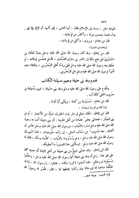 قَالَ ابْنُ إسْحَاقَ: فَكَانَ مَنْزِلُهُمْ فِي دَارِ بِنْتِ الْحَارِثِ امْرَأَةٍ مِنْ الْأَنْصَارِ، ثُمَّ مِنْ بَنِي النَّجَّارِ، فَحَدَّثَنِي بَعْضُ عُلَمَائِنَا مِنْ أَهْلِ الْمَدِينَةِ: أَنَّ بَنِي حَنِيفَةَ أَتَتْ بِهِ رَسُولَ اللَّهِ صَلَّى اللهُ عَلَيْهِ وَسَلَّمَ تَسْتُرهُ بِالثِّيَابِ، وَرَسُولُ اللَّهِ صَلَّى اللهُ عَلَيْهِ وَسَلَّمَ جَالِسٌ فِي أَصْحَابِهِ. مَعَهُ عَسِيبٌ [1] مِنْ سَعَفِ النَّخْلِ، فِي رَأسه خوصات، فَلَمَّا انْتَهَى إلَى رَسُولِ اللَّهِ صَلَّى اللهُ عَلَيْهِ وَسَلَّمَ، وَهُمْ يَسْتُرُونَهُ بِالثِّيَابِ، كَلَّمَهُ وَسَأَلَهُ، فَقَالَ لَهُ رَسُولُ اللَّهِ صَلَّى اللهُ عَلَيْهِ وَسَلَّمَ: لَوْ سَأَلْتنِي هَذَا الْعَسِيبَ مَا أَعْطَيْتُكَهُ. قَالَ ابْنُ إسْحَاقَ: وَقَدْ حَدَّثَنِي شَيْخٌ مِنْ بَنِي حَنِيفَةَ مِنْ أَهْلِ الْيَمَامَةِ أَنَّ حَدِيثَهُ كَانَ عَلَى غَيْرِ هَذَا. زَعَمَ أَنَّ وَفْدَ بَنِي حَنِيفَةَ أَتَوْا رَسُولَ اللَّهِ صَلَّى اللهُ عَلَيْهِ وَسَلَّمَ، وَخَلَّفُوا مُسَيْلِمَةَ فِي رِحَالِهِمْ، فَلَمَّا أَسْلَمُوا ذَكَرُوا مَكَانَهُ، فَقَالُوا: يَا رَسُولَ اللَّهِ، إنَّا قَدْ خَلَّفْنَا صَاحِبًا لَنَا فِي رِحَالِنَا وَفِي رِكَابِنَا يَحْفَظُهَا لَنَا، قَالَ: فَأَمَرَ لَهُ رَسُولُ اللَّهِ