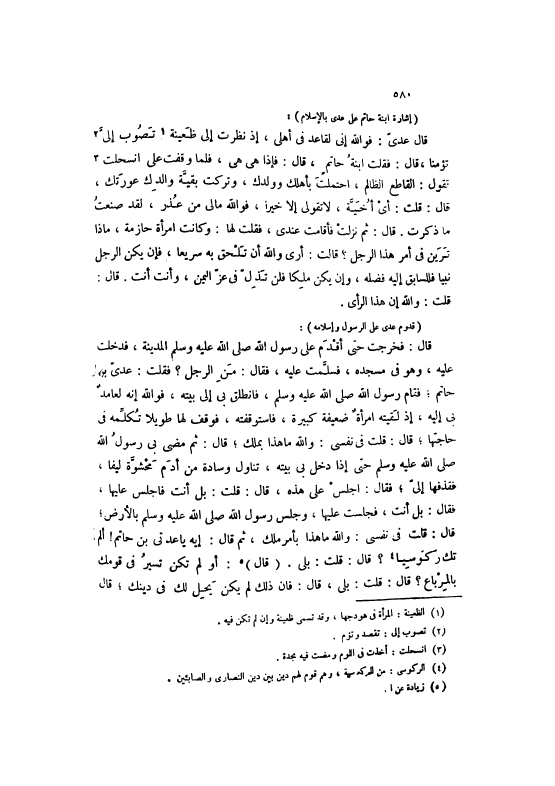 قَالَ: فَخَرَجْتُ حَتَّى أَقْدَمَ عَلَى رَسُولِ اللَّهِ صَلَّى اللهُ عَلَيْهِ وَسَلَّمَ الْمَدِينَةَ، فَدَخَلْتُ عَلَيْهِ، وَهُوَ فِي مَسْجِدِهِ، فَسَلَّمْتُ عَلَيْهِ، فَقَالَ: مَنْ الرَّجُلُ؟ فَقُلْتُ: عَدِيُّ بْنُ حَاتِمٍ، فَقَامَ رَسُولُ اللَّهِ صَلَّى اللهُ عَلَيْهِ وَسَلَّمَ، فَانْطَلَقَ بِي إِلَى بَيته، فو الله إنَّهُ لَعَامِدٌ بِي إلَيْهِ، إذْ لَقِيَتْهُ امْرَأَةٌ ضَعِيفَةٌ كَبِيرَةٌ، فَاسْتَرْقَفْتُهُ، فَوَقَفَ لَهَا طَوِيلًا تُكَلِّمُهُ فِي حَاجَتِهَا، قَالَ: قُلْتُ فِي نَفْسِي: وَاَللَّهِ مَا هَذَا بِمَلِكِ، قَالَ: ثُمَّ مَضَى بِي رَسُولُ اللَّهِ صَلَّى اللهُ عَلَيْهِ وَسَلَّمَ حَتَّى إذَا دَخَلَ بِي بَيْتَهُ، تَنَاوَلَ وِسَادَةً مِنْ أَدَمٍ مَحْشُوَّةٍ لِيفًا، فَقَذَفَهَا إلَيَّ، فَقَالَ: اجْلِسْ عَلَى هَذِهِ، قَالَ: قُلْتُ: بَلْ أَنْتَ فَاجْلِسْ عَلَيْهَا، فَقَالَ: بَلْ أَنْتَ، فَجَلَسْتُ عَلَيْهَا، وَجَلَسَ رَسُولُ اللَّهِ صَلَّى اللهُ عَلَيْهِ وَسَلَّمَ بِالْأَرْضِ، قَالَ: قُلْتُ فِي نَفْسِي: وَاَللَّهِ مَا هَذَا بِأَمْرِ مَلِكٍ، ثُمَّ قَالَ: إيِهِ يَا عَدِيَّ بْنَ حَاتِمٍ! أَلَمْ تَكُ رَكُوسِيًّا [4] ؟ قَالَ: قُلْتُ: بلَى. (قَالَ) [5] : أولم تَكُنْ تَسِيرُ فِي قَوْمِكَ بِالْمِرْبَاعِ؟ قَالَ: قُلْتُ: بَلَى، قَالَ: فَإِنَّ ذَلِكَ لَمْ يَكُنْ يَحِلُّ لَكَ فِي دِينِكَ، قَالَ