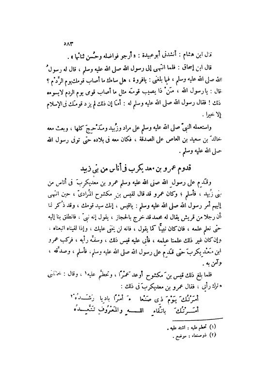 وَقَدِمَ عَلَى رَسُولِ اللَّهِ صَلَّى اللهُ عَلَيْهِ وَسَلَّمَ عَمْرو بن معديكرب فِي أُنَاسٍ مِنْ بَنِي زُبَيْدٍ، فَأَسْلَمَ، وَكَانَ عَمْرٌو قَدْ قَالَ لِقَيْسِ بْنِ مَكْشُوحٍ الْمُرَادِيَّ، حِينَ انْتَهَى إلَيْهِمْ أَمْرُ رَسُولِ اللَّهِ صَلَّى اللهُ عَلَيْهِ وَسَلَّمَ: يَا قَيْسُ، إنَّكَ سَيِّدُ قَوْمِكَ، وَقَدْ ذُكِرَ لَنَا أَنَّ رَجُلًا مِنْ قُرَيْشٍ يُقَالُ لَهُ مُحَمَّدٌ قَدْ خَرَجَ بِالْحِجَازِ، يَقُولُ إنَّهُ نَبِيٌّ، فَانْطَلِقْ بِنَّا إلَيْهِ حَتَّى نَعْلَمَ عِلْمَهُ، فَإِنْ كَانَ نَبِيًّا كَمَا يَقُولُ، فَإِنَّهُ لَنْ يَخْفَى عَلَيْكَ، وَإِذَا لَقَيْنَاهُ اتَّبَعْنَاهُ، وَإِنْ كَانَ غَيْرَ ذَلِكَ عَلِمْنَا عِلْمَهُ، فَأَبَى عَلَيْهِ قَيْسٌ ذَلِكَ، وَسَفَّهُ رَأْيَهُ، فَرَكِبَ عَمْرو ابْن معديكرب حَتَّى قَدِمَ عَلَى رَسُولِ اللَّهِ صَلَّى اللهُ عَلَيْهِ وَسَلَّمَ، فَأَسْلَمَ، وَصَدَّقَهُ، وَآمَنَ بِهِ.