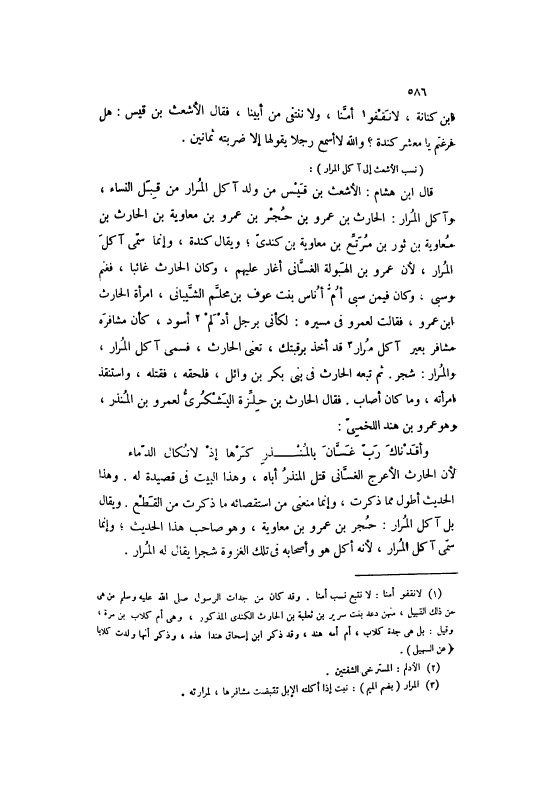 قَالَ ابْنُ هِشَامٍ: الْأَشْعَثُ بْنُ قَيْسٍ مِنْ وَلَدِ آكِلِ الْمُرَارِ مِنْ قِبَلِ النِّسَاءِ، وَآكِلُ الْمُرَارِ: الْحَارِثُ بْنُ عَمْرِو بْنِ حُجْرِ بْنِ عَمْرِو بْنِ مُعَاوِيَةَ بْنِ الْحَارِثِ بْنِ مُعَاوِيَةَ بْنِ ثَوْرِ بْنِ مُرَتِّعِ بْنِ مُعَاوِيَةَ بْنِ كِنْدِيٍّ، وَيُقَالُ كِنْدَةَ، وَإِنَّمَا سُمِّيَ آكِلَ الْمُرَارِ، لِأَنَّ عَمْرَو بْنَ الْهَبُولَةِ الْغَسَّانِيَّ أَغَارَ عَلَيْهِمْ، وَكَانَ الْحَارِثُ غَائِبًا، فَغَنِمَ وَسَبَى، وَكَانَ فِيمَنْ سَبَى أُمُّ أُنَاسَ بِنْتُ عَوْفِ بْنِ مُحَلَّمٍ الشَّيْبَانِيِّ، امْرَأَةُ الْحَارِثِ ابْن عَمْرٍو، فَقَالَتْ لِعَمْرِو فِي مَسِيرِهِ: لَكَأَنِّي بِرَجُلِ أَدْلَمْ [2] أَسْوَدَ، كَأَنَّ مَشَافِرَهُ مَشَافِرُ بَعِيرِ آكِلِ مُرَارٍ [3] قَدْ أَخَذَ بِرِقْبَتِكَ، تَعْنِي الْحَارِثَ، فَسُمِّيَ آكِلَ الْمُرَارِ، وَالْمُرَارُ: شَجَرٌ. ثُمَّ تَبِعَهُ الْحَارِثُ فِي بَنِي بَكْرِ بْنِ وَائِلٍ، فَلَحِقَهُ، فَقَتَلَهُ، وَاسْتَنْقَذَ امْرَأَتَهُ، وَمَا كَانَ أَصَابَ. فَقَالَ الْحَارِثُ بْنُ حِلِّزَةَ الْيَشْكُرِيُّ لِعَمْرِو بْنِ الْمُنْذِرِ، وَهُوَ عَمْرُو بْنُ هِنْدٍ اللَّخْمِيُّ: