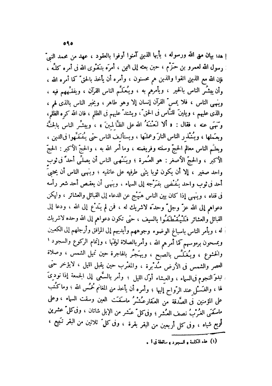 هَذَا بَيَانٌ مِنْ الله وَرَسُوله، يَا أَيهَا الَّذِينَ آمَنُوا أَوْفُوا بِالْعُقُودِ، عَهْدٌ مِنْ مُحَمَّدٍ النَّبِيِّ رَسُولِ اللَّهِ لِعَمْرِو بْنِ حَزْمٍ، حِينَ بَعَثَهُ إلَى الْيَمَنِ، أَمَرَهُ بِتَقْوَى اللَّهِ فِي أَمْرِهِ كُلِّهِ، فَإِنَّ اللَّهَ مَعَ الَّذِينَ اتَّقَوْا وَاَلَّذِينَ هُمْ مُحْسِنُونَ، وَأَمَرَهُ أَنْ يَأْخُذَ بِالْحَقِّ كَمَا أَمَرَهُ اللَّهُ، وَأَنْ يُبَشِّرَ النَّاسَ بِالْخَيْرِ، وَيَأْمُرَهُمْ بِهِ، وَيُعَلِّمَ النَّاسَ الْقُرْآنَ، وَيُفَقِّهَهُمْ فِيهِ، وَيَنْهَى النَّاسَ، فَلَا يَمَسُّ الْقُرْآنَ إنْسَانٌ إلَّا وَهُوَ طَاهِرٌ، وَيُخْبِرَ النَّاسَ بِاَلَّذِي لَهُمْ، وَاَلَّذِي عَلَيْهِمْ، وَيَلِينَ لِلنَّاسِ فِي الْحَقِّ، وَيَشْتَدَّ عَلَيْهِمْ فِي الظُّلْمِ، فَإِنَّ اللَّهَ كَرِهَ الظُّلْمَ، وَنَهَى عَنْهُ، فَقَالَ: «أَلا لَعْنَةُ اللَّهِ عَلَى الظَّالِمِينَ 11: 18» ، وَيُبَشِّرَ النَّاسَ بِالْجَنَّةِ وَبِعَمَلِهَا، وَيُنْذِرَ النَّاسَ النَّارَ وَعَمَلَهَا، وَيَسْتَأْلِفَ النَّاسَ حَتَّى يُفَقَّهُوا فِي الدِّينِ، وَيُعَلِّمَ النَّاسَ مَعَالِمَ الْحَجِّ وَسُنَّتَهُ وَفَرِيضَتَهُ، وَمَا أَمَرَ اللَّهُ بِهِ، وَالْحَجَّ الْأَكْبَرَ: الْحَجَّ الْأَكْبَرَ، وَالْحَجَّ الْأَصْغَرَ: هُوَ الْعُمْرَةُ، وَيَنْهَى النَّاسَ أَنْ يُصَلِّيَ أَحَدٌ فِي ثَوْبٍ وَاحِدٍ صَغِيرٍ، إلَّا أَنْ يَكُونَ ثَوْبًا يُثْنِي طَرَفَيْهِ عَلَى عَاتِقِيهِ، وَيَنْهَى النَّاسَ أَنْ يَحْتَبِيَ أَحَدٌ فِي ثَوْبٍ وَاحِدٍ يُفْضِي بِفَرْجِهِ إلَى السَّمَاءِ، وَيَنْهَى أَنْ يُعَقِّصَ أَحَدٌ شَعَرَ رَأْسِهِ فِي قَفَاهُ، وَيَنْهَى إذَا كَانَ بَيْنَ النَّاسِ هَيْجٌ عَنْ الدُّعَاءِ إلَى الْقَبَائِلِ وَالْعَشَائِرِ، وَلْيَكُنْ دَعَوَاهُمْ إلَى اللَّهِ عَزَّ وَجَلَّ وَحْدَهُ لَا شَرِيكَ لَهُ، فَمَنْ لَمْ يَدْعُ إلَى اللَّهِ، وَدَعَا إلَى الْقَبَائِلِ وَالْعَشَائِرِ فَلْيُقْطَفُوا بِالسَّيْفِ، حَتَّى تَكُونَ دَعْوَاهُمْ إلَى اللَّهِ وَحْدَهُ لَا شَرِيكَ لَهُ، وَيَأْمُرُ النَّاسَ بِإِسْبَاغِ الْوُضُوءِ وُجُوهَهُمْ وَأَيْدِيَهُمْ إلَى الْمَرَافِقِ وَأَرْجُلَهُمْ إلَى الْكَعْبَيْنِ وَيَمْسَحُونَ بِرُءُوسِهِمْ كَمَا أَمَرَهُمْ اللَّهُ، وَأَمَرَ بِالصَّلَاةِ لِوَقْتِهَا، وَإِتْمَامِ الرُّكُوعِ وَالسُّجُودِ [1] وَالْخُشُوعِ، وَيُغَلِّسُ بِالصُّبْحِ، وَيُهَجِّرُ بِالْهَاجِرَةِ حِينَ تَمِيلُ الشَّمْسُ، وَصَلَاةُ الْعَصْرِ وَالشَّمْسُ فِي الْأَرْضِ مُدْبِرَةٌ، وَالْمَغْرِبُ حِينَ يَقْبَلُ اللَّيْلُ، لَا يُؤَخَّرُ حَتَّى تَبْدُوَ النُّجُومُ فِي السَّمَاءِ، وَالْعِشَاءُ أَوَّلُ اللَّيْلِ، وَأَمَرَ بِالسَّعْيِ إلَى الْجُمُعَةِ إذَا نُودِيَ لَهَا، وَالْغُسْلِ عِنْدَ الرَّوَاحِ إلَيْهَا، وَأَمَرَهُ أَنْ يَأْخُذَ مِنْ الْمَغَانِمِ خُمُسَ اللَّهِ، وَمَا كُتِبَ عَلَى الْمُؤْمِنِينَ فِي الصَّدَقَةِ مِنْ الْعَقَارِ عُشْرَ مَا سَقَتْ الْعَيْنُ وَسَقَتْ السَّمَاءُ، وَعَلَى مَا سَقَى الْغَرْبُ نِصْفَ الْعُشْرِ، وَفِي كُلِّ عَشْرٍ مِنْ الْإِبِلِ شَاتَانِ، وَفِي كُلِّ عِشْرِينَ أَرْبَعُ شِيَاهٍ، وَفِي كُلِّ أَرْبَعِينَ مِنْ الْبَقَرِ بَقَرَةٌ، وَفِي كُلِّ ثَلَاثِينَ مِنْ الْبَقَرِ تَبِيعٌ،