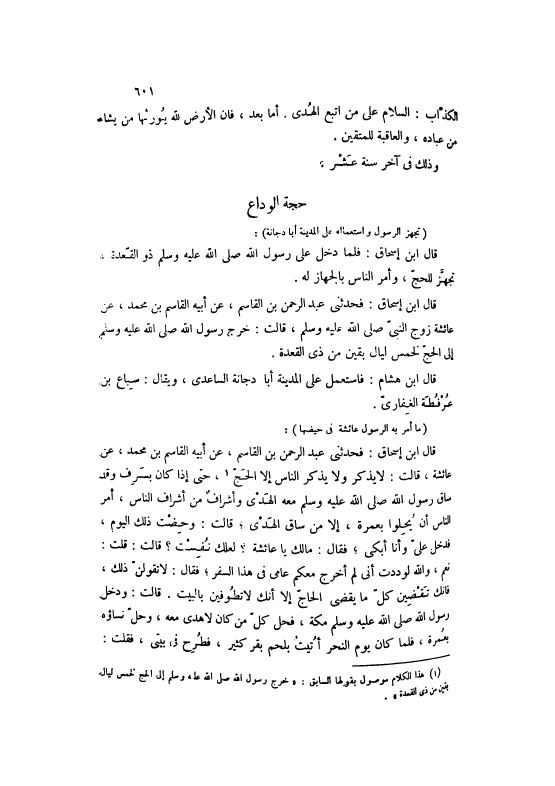 قَالَ ابْنُ إسْحَاقَ: فَحَدَّثَنِي عَبْدُ الرَّحْمَنِ بْنُ الْقَاسِمِ، عَنْ أَبِيهِ الْقَاسِمِ بْنِ مُحَمَّدٍ، عَنْ عَائِشَةَ زَوْجِ النَّبِيِّ صَلَّى اللهُ عَلَيْهِ وَسَلَّمَ، قَالَتْ: خَرَجَ رَسُولُ اللَّهِ صَلَّى اللهُ عَلَيْهِ وَسَلَّمَ إلَى الْحَجِّ لِخَمْسِ لَيَالٍ بَقِينَ مِنْ ذِي الْقَعَدَةِ.