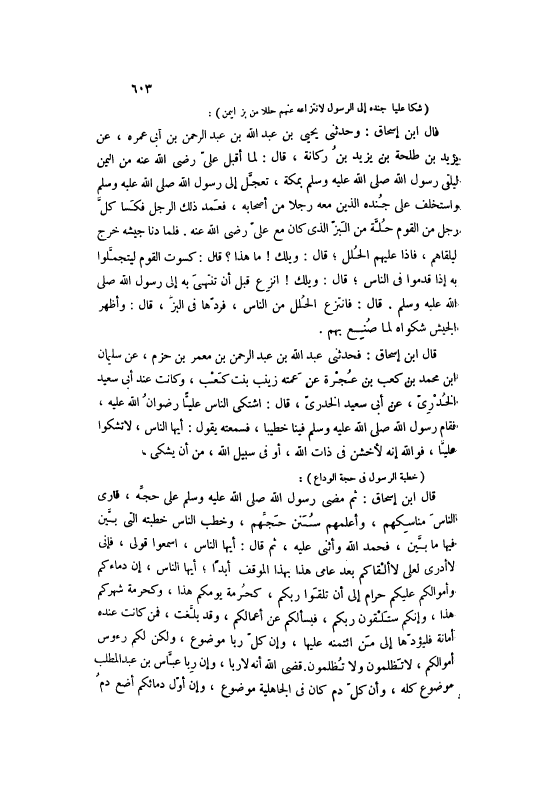 قَالَ ابْنُ إسْحَاقَ: ثُمَّ مَضَى رَسُولُ اللَّهِ صَلَّى اللهُ عَلَيْهِ وَسَلَّمَ عَلَى حَجِّهِ، فَأَرَى النَّاسَ مَنَاسِكَهُمْ، وَأَعْلَمَهُمْ سُنَنَ حَجِّهِمْ، وَخَطَبَ النَّاسَ خُطْبَتَهُ الَّتِي بَيَّنَ فِيهَا مَا بَيَّنَ، فَحَمِدَ اللَّهَ وَأَثْنَى عَلَيْهِ، ثُمَّ قَالَ: أَيُّهَا النَّاسُ، اسْمَعُوا قَوْلِي، فَإِنِّي لَا أَدْرِي لَعَلِّي لَا أَلْقَاكُمْ بَعْدَ عَامِي هَذَا بِهَذَا الْمَوْقِفِ أَبَدًا، أَيُّهَا النَّاسُ، إنَّ دِمَاءَكُمْ وَأَمْوَالَكُمْ عَلَيْكُمْ حَرَامٌ إلَى أَنْ تَلْقَوْا رَبَّكُمْ، كَحُرْمَةِ يَوْمِكُمْ هَذَا، وَكَحُرْمَةِ شَهْرِكُمْ هَذَا، وَإِنَّكُمْ سَتَلْقَوْنَ رَبَّكُمْ، فَيَسْأَلُكُمْ عَنْ أَعْمَالِكُمْ، وَقَدْ بَلَّغْتُ، فَمَنْ كَانَتْ عِنْدَهُ أَمَانَةٌ فَلِيُؤَدِّهَا إلَى مَنْ ائْتَمَنَهُ عَلَيْهَا، وَإِنَّ كُلَّ رِبًا مَوْضُوعٌ، وَلَكِنْ لَكُمْ رُءُوسُ أَمْوَالِكُمْ، لَا تَظْلِمُونَ وَلَا تُظْلَمُونَ. قَضَى اللَّهُ أَنَّهُ لَا رِبَا، وَإِنَّ رِبَا عَبَّاسِ بْنِ عَبْدِ الْمُطَّلِبِ مَوْضُوعٌ كُلُّهُ، وَأَنَّ كُلَّ دَمٍ كَانَ فِي الْجَاهِلِيَّةِ مَوْضُوعٌ، وَإِنَّ أَوَّلَ دِمَائِكُمْ أَضَعُ دَمُ