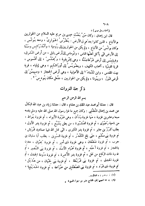 بِسْمِ اللَّهِ الرَّحْمَنِ الرَّحِيمِ قَالَ: حَدَّثَنَا أَبُو مُحَمَّدٍ عَبْدُ الْمَلِكِ بْنُ هِشَامٍ، قَالَ: حَدَّثَنَا زِيَادُ بْنُ عَبْدِ اللَّهِ الْبَكَّائِيَّ عَنْ مُحَمَّدِ بْنِ إسْحَاقَ الْمُطَّلِبِيِّ: وَكَانَ جَمِيعُ مَا غَزَا رَسُولُ اللَّهِ صَلَّى اللهُ عَلَيْهِ وَسَلَّمَ بِنَفْسِهِ سَبْعًا وَعِشْرِينَ غَزْوَةً، مِنْهَا غَزْوَةُ وَدَّانَ، وَهِيَ غَزْوَةُ الْأَبْوَاءِ، ثُمَّ غَزْوَةُ بُوَاطَ، مِنْ نَاحِيَةِ رَضْوَى، ثُمَّ غَزْوَةُ الْعَشِيرَةِ، مِنْ بَطْنِ يَنْبُعَ، ثُمَّ غَزْوَةُ بَدْرٍ الْأُولَى، يَطْلُبُ كُرْزَ بْنَ جَابِرٍ، ثُمَّ غَزْوَةُ بَدْرٍ الْكُبْرَى، الَّتِي قَتَلَ اللَّهُ فِيهَا صَنَادِيدَ قُرَيْشٍ، ثُمَّ غَزْوَةُ بَنِي سُلَيْمٍ، حَتَّى بَلَغَ الْكُدْرَ، ثُمَّ غَزْوَةُ السَّوِيقِ، يَطْلُبُ أَبَا سُفْيَانَ بْنَ حَرْبٍ، ثُمَّ غَزْوَةُ غَطَفَانَ، وَهِيَ غَزْوَةُ ذِي أَمِرٍ، ثُمَّ غَزْوَةُ بَحْرَانَ، مَعْدِنٌ بِالْحِجَازِ، ثُمَّ غَزْوَةُ أُحُدٍ، ثُمَّ غَزْوَةُ حَمْرَاءَ الْأَسَدِ، ثُمَّ غَزْوَةُ بَنِي النَّضِيرِ، ثُمَّ غَزْوَةُ ذَاتِ الرِّقَاعِ مِنْ نَخْلٍ، ثُمَّ غَزْوَةُ بَدْرٍ الْآخِرَةِ، ثُمَّ غَزْوَةُ دَوْمَةِ الْجَنْدَلِ، ثُمَّ غَزْوَةُ الْخَنْدَقِ، ثُمَّ غَزْوَةُ بَنِي قُرَيْظَةَ، ثُمَّ غَزْوَةُ بَنِي لِحْيَانَ، مِنْ هُذَيْلٍ، ثُمَّ غَزْوَةُ ذِي قَرَدٍ، ثُمَّ غَزْوَةُ بَنِي الْمُصْطَلِقِ مِنْ خُزَاعَةَ، ثُمَّ غَزْوَةُ الْحُدَيْبِيَةِ،