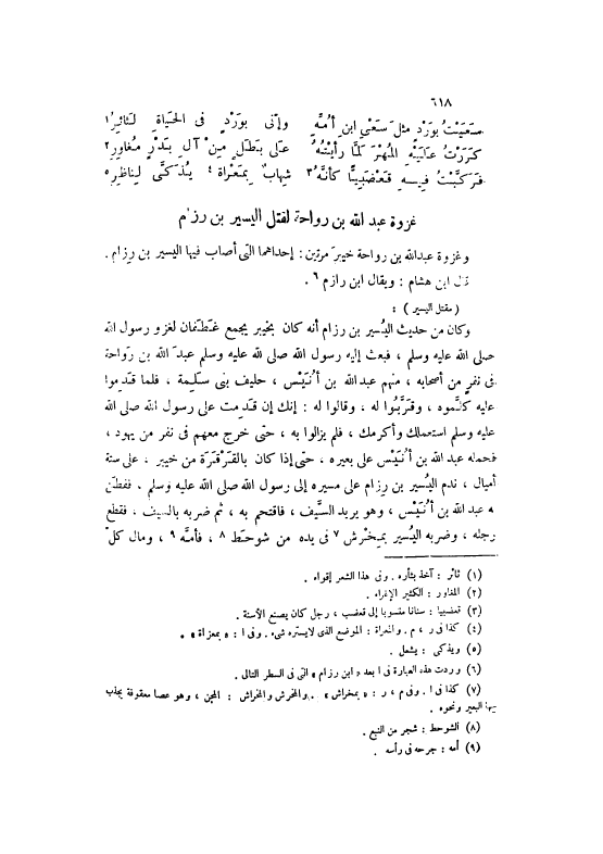 وَكَانَ مِنْ حَدِيثِ الْيَسِيرِ بْنِ رِزَامٍ أَنَّهُ كَانَ بِخَيْبَرِ يَجْمَعُ غَطَفَانَ لِغَزْوِ رَسُولِ اللَّهِ صَلَّى اللهُ عَلَيْهِ وَسَلَّمَ، فَبَعَثَ إلَيْهِ رَسُولُ اللَّهِ صَلَّى اللهُ عَلَيْهِ وَسَلَّمَ عَبْدَ اللَّهِ بْنَ رَوَاحَةَ فِي نَفَرٍ مِنْ أَصْحَابِهِ، مِنْهُمْ عَبْدُ اللَّهِ بْنُ أُنَيْسٍ، حَلِيفُ بَنِي سَلِمَةَ، فَلَمَّا قَدِمُوا عَلَيْهِ كَلَّمُوهُ، وَقَرَّبُوا لَهُ، وَقَالُوا لَهُ: إنَّكَ إنْ قَدِمْتُ عَلَى رَسُولِ اللَّهِ صَلَّى اللهُ عَلَيْهِ وَسَلَّمَ اسْتَعْمَلَكَ وَأَكْرَمَكَ، فَلَمْ يَزَالُوا بِهِ، حَتَّى خَرَجَ مَعَهُمْ فِي نَفَرٍ مِنْ يَهُودَ، فَحَمَلَهُ عَبْدُ اللَّهِ بْنُ أُنَيْسٍ عَلَى بَعِيرِهِ، حَتَّى إذَا كَانَ بِالْقَرْقَرَةِ مِنْ خَيْبَرَ، عَلَى سِتَّةِ أَمْيَالٍ، نَدِمَ الْيَسِيرُ بْنُ رِزَامٍ عَلَى مَسِيرِهِ إلَى رَسُولِ اللَّهِ صَلَّى اللهُ عَلَيْهِ وَسَلَّمَ، فَفَطَنَ لَهُ عَبْدُ اللَّهِ بْنُ أُنَيْسٍ، وَهُوَ يُرِيدُ السَّيْفَ، فَاقْتَحَمَ بِهِ، ثُمَّ ضَرَبَهُ بِالسَّيْفِ، فَقَطَعَ رِجْلَهُ، وَضَرَبَهُ الْيَسِيرُ بِمِخْرَشٍ [7] فِي يَدِهِ مِنْ شَوْحَطٍ [8] ، فَأَمَّهُ [9] ، وَمَالَ كُلُّ