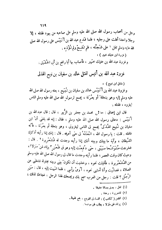 قَالَ ابْنُ إسْحَاقَ: حَدَّثَنِي مُحَمَّدُ بْنُ جَعْفَرِ بْنِ الزُّبَيْرِ، قَالَ: قَالَ عَبْدُ اللَّهِ بْنُ أُنَيْسٍ: دَعَانِي رَسُولُ اللَّهِ صَلَّى اللهُ عَلَيْهِ وَسَلَّمَ، فَقَالَ: إنَّهُ قَدْ بَلَغَنِي أَنَّ ابْنَ سُفْيَانَ بْنِ نُبَيْحٍ الْهُذَلِيَّ يَجْمَعُ لِي النَّاسَ لِيَغْزُونِي، وَهُوَ بِنَخْلَةَ أَوْ بِعُرَنَةَ، فَأْتِهِ فَاقْتُلْهُ. قُلْتُ: يَا رَسُولَ اللَّهِ، انْعَتْهُ لِي حَتَّى أَعْرِفَهُ. قَالَ: إنَّكَ إذَا رَأَيْتُهُ أَذْكَرَكَ الشَّيْطَانَ، وَآيَةُ مَا بَيْنَكَ وَبَيْنَهُ أَنَّكَ إذَا رَأَيْتُهُ وَجَدْتُ لَهُ قُشَعْرِيرَةً [2] . قَالَ: