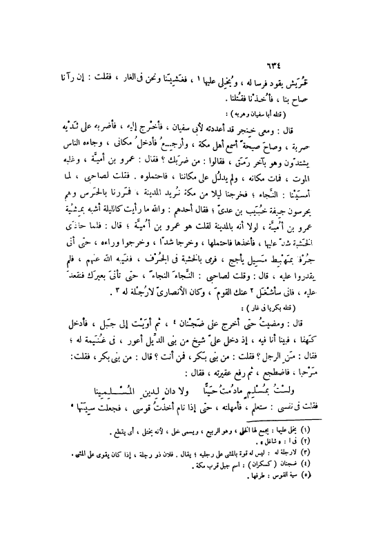 قَالَ: وَمَعِي خِنْجَرٌ قَدْ أَعْدَدْتُهُ لِأَبِي سُفْيَانَ، فَأَخْرُجُ إلَيْهِ، فَأَضْرِبُهُ عَلَى ثَدْيِهِ ضَرْبَةً، وَصَاحَ صَيْحَةً أَسْمَعَ أَهْلَ مَكَّةَ، وَأَرْجِعُ فَأَدْخُلُ مَكَانِي، وَجَاءَهُ النَّاسُ يَشْتَدُّونَ وَهُوَ بِآخِرِ رَمَقٍ، فَقَالُوا: مَنْ ضَرَبَكَ؟ فَقَالَ: عَمْرُو بْنُ أُمَيَّةَ، وَغَلَبَهُ الْمَوْتُ، فَمَاتَ مَكَانَهُ، وَلَمْ يَدْلُلْ عَلَى مَكَانِنَا، فَاحْتَمَلُوهُ. فَقُلْتُ لِصَاحِبِي، لَمَّا أَمْسَيْنَا: النَّجَاءُ، فَخَرَجْنَا لَيْلًا مِنْ مَكَّةَ نُرِيدُ الْمَدِينَةَ، فَمَرَرْنَا بِالْحَرَسِ وَهُمْ يَحْرَسُونَ جِيفَةَ خُبَيْبِ بْنِ عَدِيٍّ، فَقَالَ أَحَدُهُمْ: وَاَللَّهِ مَا رَأَيْتُ كَاللَّيْلَةِ أَشَبَهَ بِمِشْيَةِ عَمْرِو بْنِ أُمَيَّةَ، لَوْلَا أَنَّهُ بِالْمَدِينَةِ لَقُلْتُ هُوَ عَمْرُو بْنُ أُمَيَّةَ، قَالَ: فَلَمَّا حَاذَى الْخَشَبَةَ شَدَّ عَلَيْهَا، فَأَخَذَهَا فَاحْتَمَلَهَا، وَخَرَجَا شَدًّا، وَخَرَجُوا وَرَاءَهُ، حَتَّى أَتَى جُرْفًا بِمَهْبِطِ مَسِيلِ يَأْجَجَ، فَرَمَى بِالْخَشَبَةِ فِي الْجُرْفِ، فَغَيَّبَهُ اللَّهُ عَنْهُمْ، فَلَمْ يَقْدِرُوا عَلَيْهِ، قَالَ: وَقُلْتُ لِصَاحِبِي: النَّجَاءَ النَّجَاءَ، حَتَّى تَأْتِيَ بَعِيرَكَ فَتَقْعُدَ عَلَيْهِ، فَإِنِّي سَأَشْغَلُ [2] عَنْكَ الْقَوْمَ، وَكَانَ الْأَنْصَارِيُّ لَا رُجْلَةَ لَهُ [3] .