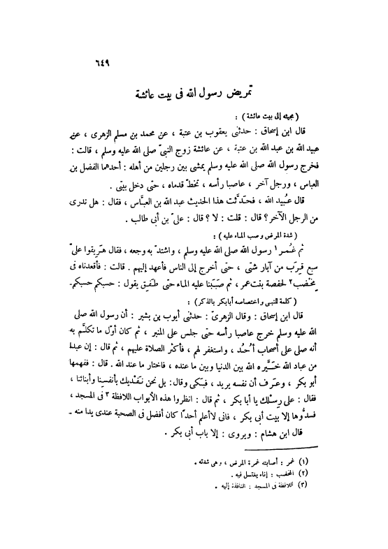 فَخَرَجَ رَسُولُ اللَّهِ صَلَّى اللهُ عَلَيْهِ وَسَلَّمَ يَمْشِي بَيْنَ رَجُلَيْنِ مِنْ أَهْلِهِ: أَحَدُهُمَا الْفَضْلُ بْنُ الْعَبَّاسِ، وَرَجُلٌ آخَرُ، عَاصِبًا رَأْسَهُ، تَخُطُّ قَدَمَاهُ، حَتَّى دَخَلَ بَيْتِي.