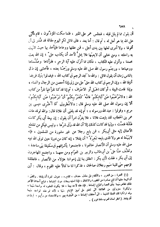 أَنْ يَقُولَ مِمَّا لَمْ يَقُلْ قَبْلَهُ، فَجَلَسَ عُمَرُ عَلَى الْمِنْبَرِ، فَلَمَّا سَكَتَ الْمُؤَذِّنُونَ، قَامَ فَأَثْنَى عَلَى اللَّهِ بِمَا هُوَ أَهْلٌ لَهُ، ثُمَّ قَالَ: أَمَّا بَعْدُ، فَإِنِّي قَائِلٌ لَكُمْ الْيَوْمَ مَقَالَةً قَدْ قُدِّرَ لي أَن أَولهَا، وَلَا أَدْرِي لَعَلَّهَا بَيْنَ يَدَيْ أَجَلِي، فَمَنْ عقلهَا ووعاها فليأخذ بِهَا حَيْثُ انْتَهَتْ بِهِ رَاحِلَتُهُ، وَمَنْ خَشِيَ أَنْ لَا يَعِيَهَا فَلَا يَحِلُّ لِأَحَدِ أَنْ يَكْذِبَ عَلَيَّ، إنَّ اللَّهَ بَعَثَ مُحَمَّدًا، وَأَنْزَلَ عَلَيْهِ الْكِتَابَ، فَكَانَ مِمَّا أَنَزَلَ عَلَيْهِ آيَةَ الرَّجْمِ، فَقَرَأْنَاهَا وَعُلِّمْنَاهَا وَوَعَيْنَاهَا، وَرَجَمَ رَسُولُ اللَّهِ صَلَّى اللهُ عَلَيْهِ وَسَلَّمَ وَرَجَمْنَا بَعْدَهُ، فَأَخْشَى إنْ طَالَ بِالنَّاسِ زَمَانٌ أَنْ يَقُولَ قَائِلٌ: وَاَللَّهِ مَا نَجِدُ الرَّجْمَ فِي كِتَابِ اللَّهِ، فَيَضِلُّوا بِتَرْكِ فَرِيضَةٍ أَنَزَلَهَا اللَّهُ، وَإِنَّ الرَّجْمَ فِي كِتَابِ اللَّهِ حَقٌّ عَلَى مَنْ زَنَى إذَا أُحْصِنَ مِنْ الرِّجَالِ وَالنِّسَاءِ، وَإِذَا قَامَتْ الْبَيِّنَةُ، أَوْ كَانَ الْحَبْلُ أَوْ الِاعْتِرَافُ، ثُمَّ إنَّا قَدْ كُنَّا نَقْرَأُ فِيمَا نَقْرَأُ مِنْ كِتَابِ اللَّهِ: «لَا تَرْغَبُوا عَنْ آبَائِكُمْ فَإِنَّهُ كُفْرٌ بِكُمْ أَنْ تَرْغَبُوا عَنْ آبَائِكُمْ» أَلَا إنَّ رَسُولَ اللَّهِ صَلَّى اللهُ عَلَيْهِ وَسَلَّمَ قَالَ: «لَا تُطْرُونِي كَمَا أُطْرِيَ عِيسَى بن مَرْيَمَ، وَقُولُوا: عَبْدُ اللَّهِ وَرَسُولُهُ» ، ثُمَّ إنَّهُ قَدْ بَلَغَنِي أَنَّ فُلَانًا قَالَ: وَاَللَّهِ لَوْ قَدْ مَاتَ عُمَرُ بْنُ الْخَطَّابِ لَقَدْ بَايَعْتُ فُلَانًا، فَلَا يَغُرَّنَّ امْرَأً أَنْ يَقُولُ: إنَّ بَيْعَةَ أَبِي بَكْرٍ كَانَتْ فَلْتَةً فَتَمَّتْ، وَإِنَّهَا قَدْ كَانَتْ كَذَلِكَ إلَّا أَنَّ اللَّهَ قَدْ وَقَى شَرَّهَا، وَلَيْسَ فِيكُمْ مَنْ تَنْقَطِعُ الْأَعْنَاقُ إلَيْهِ مِثْلَ أَبِي بَكْرٍ، فَمَنْ بَايَعَ رَجُلًا عَنْ غَيْرِ مَشُورَةٍ مِنْ الْمُسْلِمِينَ، فَإِنَّهُ لَا بَيْعَةَ لَهُ هُوَ وَلَا الَّذِي بَايَعَهُ تَغِرَّةً [1] أَنْ يَقْتُلَا، إنَّهُ كَانَ مِنْ خَبَرِنَا حِينَ تَوَفَّى اللَّهُ نَبِيَّهُ صَلَّى اللهُ عَلَيْهِ وَسَلَّمَ أَنَّ الْأَنْصَارَ خَالَفُونَا، فَاجْتَمَعُوا بِأَشْرَافِهِمْ فِي سَقِيفَةِ بَنِي سَاعِدَةَ، وَتَخَلَّفَ عَنَّا عَلِيُّ بْنُ أَبِي طَالِبٍ وَالزَّبِيرُ بْنُ الْعَوَّامِ وَمَنْ مَعَهُمَا، وَاجْتَمَعَ الْمُهَاجِرُونَ إلَى أَبِي بَكْرٍ، فَقُلْتُ لِأَبِي بَكْرٍ: انْطَلِقْ بِنَا إلَى إخْوَانِنَا هَؤُلَاءِ مِنْ الْأَنْصَارِ، فَانْطَلَقْنَا نَؤُمُّهُمْ حَتَّى لَقينَا مِنْهُم رجلا صَالِحَانِ، فَذَكَرَا لَنَا مَا تَمَالَأَ عَلَيْهِ الْقَوْمُ، وَقَالَ: أَيْنَ