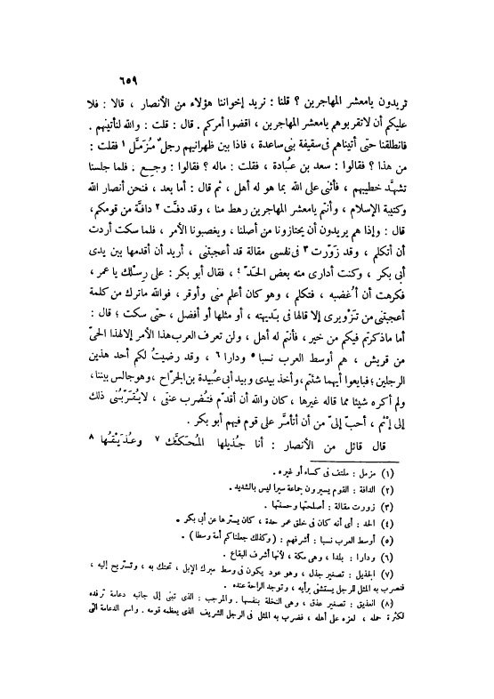 مَنْ هَذَا؟ فَقَالُوا: سَعْدُ بْنُ عُبَادَةَ، فَقُلْتُ: مَا لَهُ؟ فَقَالُوا: وَجِعَ. فَلَمَّا جَلَسْنَا تَشَهَّدَ خَطِيبُهُمْ، فَأَثْنَى عَلَى اللَّهِ بِمَا هُوَ لَهُ أَهْلٌ، ثُمَّ قَالَ: أَمَّا بَعْدُ، فَنَحْنُ أَنْصَارُ اللَّهِ وَكَتِيبَةُ الْإِسْلَامِ، وَأَنْتُمْ يَا مَعْشَرَ الْمُهَاجِرِينَ رَهْطٌ مِنَّا، وَقَدْ دَفَّتْ [2] دَافَّةٌ مِنْ قَوْمِكُمْ، قَالَ: وَإِذَا هُمْ يُرِيدُونَ أَنْ يَحْتَازُونَا مِنْ أَصْلِنَا، وَيَغْصِبُونَا الْأَمْرَ، فَلَمَّا سَكَتَ أَرَدْتُ أَنْ أَتَكَلَّمَ، وَقَدْ زَوَّرَتْ [3] فِي نَفْسِي مَقَالَةٌ قَدْ أَعْجَبَتْنِي، أُرِيدُ أَنْ أُقَدِّمَهَا بَيْنَ يَدَيْ أَبِي بَكْرٍ، وَكُنْتُ أَدَارِي مِنْهُ بَعْضَ الْحَدِّ [4] ، فَقَالَ أَبُو بَكْرٍ: عَلَى رِسْلِكَ يَا عُمَرَ، فَكَرِهْتُ أَنْ أُغْضِبَهُ، فَتَكَلَّمَ، وَهُوَ كَانَ أَعْلَمَ منى وأوقر، فو الله مَا تَرَكَ مِنْ كَلِمَةٍ أَعْجَبَتْنِي مِنْ تَزْوِيرِي إلَّا قَالَهَا فِي بَدِيهَتِهِ، أَوْ مِثْلَهَا أَوْ أَفْضَلَ، حَتَّى سَكَتَ، قَالَ: