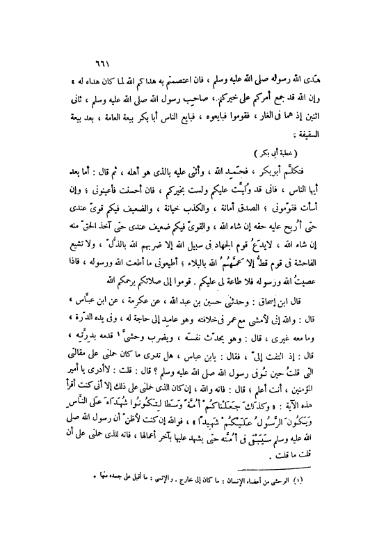 قَالَ ابْنُ إسْحَاقَ: وَحَدَّثَنِي حُسَيْنُ بْنُ عَبْدِ اللَّهِ، عَنْ عِكْرِمَةَ، عَنْ ابْنِ عَبَّاسٍ، قَالَ: وَاَللَّهِ إنِّي لَأَمْشِي مَعَ عُمَرَ فِي خِلَافَتِهِ وَهُوَ عَامِدٌ إلَى حَاجَةٍ لَهُ، وَفِي يَدِهِ الدِّرَّةُ، وَمَا مَعَهُ غَيْرِي، قَالَ: وَهُوَ يُحَدِّثُ نَفْسَهُ، وَيَضْرِبُ وَحْشِيَّ [1] قَدَمهُ بِدِرَّتِهِ، قَالَ: إذْ الْتَفَتَ إلَيَّ، فَقَالَ: يَا بْنَ عَبَّاسٍ، هَلْ تَدْرِي مَا كَانَ حَمَلَنِي عَلَى مَقَالَتِي الَّتِي قُلْتُ حِينَ تُوُفِّيَ رَسُولُ اللَّهِ صَلَّى اللهُ عَلَيْهِ وَسَلَّمَ؟ قَالَ: قُلْتُ: لَا أَدْرِي يَا أَمِيرَ الْمُؤْمِنِينَ، أَنْتَ أَعْلَمُ، قَالَ: فَإِنَّهُ وَاَللَّهِ، إنْ كَانَ الَّذِي حَمَلَنِي عَلَى ذَلِكَ إلَّا أَنِّي كُنْتُ أَقْرَأُ هَذِهِ الْآيَةَ: وَكَذلِكَ جَعَلْناكُمْ أُمَّةً وَسَطاً لِتَكُونُوا شُهَداءَ عَلَى النَّاسِ وَيَكُونَ الرَّسُولُ عَلَيْكُمْ شَهِيداً 2: 143، فو الله إنْ كُنْتُ لَأَظُنُّ أَنَّ رَسُولَ اللَّهِ صَلَّى اللهُ عَلَيْهِ وَسَلَّمَ سَيَبْقَى فِي أُمَّتِهِ حَتَّى يَشْهَدَ عَلَيْهَا بِآخِرِ أَعْمَالِهَا، فَإِنَّهُ لِلَّذِي حَمَلَنِي عَلَى أَنْ قُلْتُ مَا قُلْتُ.