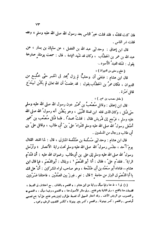 [1] فِي أ، ط هُنَا وَفِيمَا سَيَأْتِي رِوَايَة عَن ابْن هِشَام: «القصم» بِالْقَافِ. مَعَ اخْتِلَاف فِي الضَّبْط، فضبطت هُنَا بِالْفَتْح، وَفِي الثَّانِيَة بِضَم فَفتح. وَفِي سَائِر الْأُصُول هُنَا: «القصيم» وَفِيمَا سَيَأْتِي: «الفصيم» والتصويب عَن الرَّوْض الْأنف. وَقد اخْتَار السهيليّ أَن تضبط على الرِّوَايَتَيْنِ بِضَم فَفتح على أَنَّهَا جمع قصمى أَو فصمى. والقصم: كسر ببينونة. والفصم: كسر بِغَيْر بينونة، ككسر الْقَضِيب الرطب وَنَحْوه.