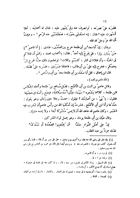 فَضَرَبَهُ عَلِيٌّ فَصَرَعَهُ، ثُمَّ انْصَرَفَ عَنْهُ وَلَمْ يُجْهَزْ عَلَيْهِ، فَقَالَ لَهُ أَصْحَابُهُ: أَفَلَا أُجْهِزْتُ عَلَيْهِ؟ فَقَالَ: إنَّهُ اسْتَقْبَلَنِي بِعَوْرَتِهِ، فَعَطَفَتْنِي عَنْهُ الرَّحِمُ [1] ، وَعَرَفْتُ أَنَّ اللَّهَ عَزَّ وَجَلَّ قَدْ قَتَلَهُ. وَيُقَالُ: إنَّ أَبَا سَعْدِ [2] بْنِ أَبِي طَلْحَةَ خَرَجَ بَيْنَ الصَّفَّيْنِ، فَنَادَى: [أَنَا قَاصِمٌ [3]] مَنْ يُبَارِزُ بِرَازًا، فَلَمْ يَخْرَجْ إلَيْهِ أَحَدٌ. فَقَالَ: يَا أَصْحَابَ مُحَمَّدٍ، زَعَمْتُمْ أَنَّ قَتْلَاكُمْ فِي الْجَنَّةِ، وَأَنَّ قَتْلَانَا فِي النَّار، كَذبْتُمْ وَاللات! لَوْ تَعْلَمُونَ ذَلِكَ حَقًّا لَخَرَجَ إلَيَّ بَعْضُكُمْ، فَخَرَجَ إلَيْهِ عَلِيُّ بْنُ أَبِي طَالِبٍ، فَاخْتَلَفَا ضَرْبَتَيْنِ، فَضَرَبَهُ عَلِيٌّ فَقَتَلَهُ.