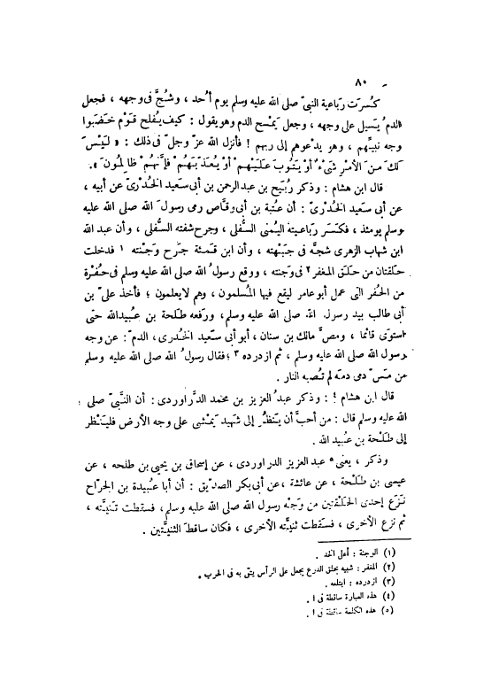 كُسِرَتْ رَبَاعِيَةُ النَّبِيِّ صَلَّى اللهُ عَلَيْهِ وَسَلَّمَ يَوْمَ أُحُدٍ، وَشُجَّ فِي وَجْهِهِ، فَجَعَلَ الدَّمُ يَسِيلُ عَلَى وَجْهِهِ، وَجَعَلَ يَمْسَحُ الدَّمَ وَهُوَ يَقُولُ: كَيْفَ يُفْلِحُ قَوْمٌ خَضَبُوا وَجْهَ نَبِيِّهِمْ، وَهُوَ يَدْعُوهُمْ إلَى رَبِّهِمْ! فَأَنْزَلَ اللَّهُ عَزَّ وَجَلَّ فِي ذَلِكَ: «لَيْسَ لَكَ مِنَ الْأَمْرِ شَيْءٌ أَوْ يَتُوبَ عَلَيْهِمْ أَوْ يُعَذِّبَهُمْ فَإِنَّهُمْ ظالِمُونَ 3: 128» . قَالَ ابْنُ هِشَامٍ: وَذَكَرَ رُبَيْحُ بْنُ عَبْدِ الرَّحْمَنِ بْنِ أَبِي سَعِيدٍ الْخُدْرِيِّ عَنْ أَبِيهِ، عَنْ أَبِي سَعِيدٍ الْخُدْرِيِّ: أَنَّ عُتْبَةُ بْنَ أَبِي وَقَّاصٍ رَمَى رَسُولَ اللَّهِ صَلَّى اللهُ عَلَيْهِ وَسَلَّمَ يَوْمئِذٍ، فَكَسَرَ رَبَاعِيَتَهُ الْيُمْنَى السُّفْلَى، وَجَرَحَ شَفَتَهُ السُّفْلَى، وَأَنَّ عَبْدَ اللَّهِ ابْن شِهَابٍ الزُّهْرِيَّ شَجَّهُ فِي جَبْهَتِهِ، وَأَنَّ ابْنَ قَمِئَةَ جَرَحَ وَجْنَتَهُ [1] فَدَخَلَتْ حَلْقَتَانِ مِنْ حَلَقِ المغفر [2] فِي وَجْنَتَهُ، وَوَقَعَ رَسُولُ اللَّهِ صَلَّى اللهُ عَلَيْهِ وَسَلَّمَ فِي حُفْرَةٍ مِنْ الْحُفَرِ الَّتِي عَمِلَ أَبُو عَامِرٍ لِيَقَعَ فِيهَا الْمُسْلِمُونَ، وَهُمْ لَا يَعْلَمُونَ، فَأَخَذَ عَلِيُّ بْنُ أَبِي طَالِبٍ بِيَدِ رَسُولِ اللَّهِ صَلَّى اللهُ عَلَيْهِ وَسَلَّمَ، وَرَفَعَهُ طَلْحَةُ بْنُ عُبَيْدِ اللَّهِ حَتَّى اسْتَوَى قَائِمًا، وَمَصَّ مَالِكُ بْنُ سِنَانٍ، أَبُو أَبِي سَعِيدٍ الْخُدْرِيِّ، الدَّمَّ: عَنْ وَجْهِ رَسُولِ اللَّهِ صَلَّى اللهُ عَلَيْهِ وَسَلَّمَ، ثُمَّ ازْدَرَدَهُ [3] ، فَقَالَ رَسُولُ اللَّهِ صَلَّى اللهُ عَلَيْهِ وَسَلَّمَ مَنْ مَسَّ دَمِي دَمَهُ لَمْ تُصِبْهُ النَّارُ. قَالَ ابْنُ هِشَامٍ [4] : وَذَكَرَ عَبْدُ الْعَزِيزِ بْنُ مُحَمَّدٍ الدَّرَاوَرْدِيُّ: أَنَّ النَّبِيَّ صَلَّى اللهُ عَلَيْهِ وَسَلَّمَ قَالَ: مَنْ أَحَبَّ أَنْ يَنْظُرَ إلَى شَهِيدٍ يَمْشِي عَلَى وَجْهِ الْأَرْضِ فَلْيَنْظُرْ إلَى طَلْحَةَ بْنِ عُبَيْدِ اللَّهِ. وَذَكَرَ، يَعْنِي [5] عَبْدَ الْعَزِيزِ الدراوَرْديّ، عَنْ إسْحَاقَ بْنِ يَحْيَى بْنِ طَلْحَةَ، عَنْ عِيسَى بْنِ طَلْحَةَ، عَنْ عَائِشَةَ، عَنْ أَبِي بَكْرٍ الصِّدِّيقِ: أَنَّ أَبَا عُبَيْدَةَ بْنِ الْجَرَّاحِ نَزَعَ إحْدَى الْحَلْقَتَيْنِ مِنْ وَجْهِ رَسُولِ اللَّهِ صَلَّى اللهُ عَلَيْهِ وَسَلَّمَ، فَسَقَطَتْ ثَنِيَّتُهُ، ثُمَّ نَزَعَ الْأُخْرَى، فَسَقَطَتْ ثَنِيَّتُهُ الْأُخْرَى، فَكَانَ سَاقِطَ الثَّنِيَّتَيْنِ.