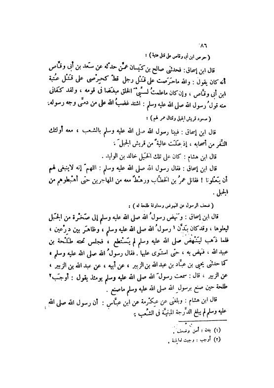 قَالَ ابْنُ إسْحَاقَ: وَنَهَضَ رَسُولُ اللَّهِ صَلَّى اللهُ عَلَيْهِ وَسَلَّمَ إلَى صَخْرَةٍ مِنْ الْجَبَلِ لِيَعْلُوَهَا، وَقَدْ كَانَ بَدُنَ [1] رَسُولُ اللَّهِ صَلَّى اللهُ عَلَيْهِ وَسَلَّمَ، وَظَاهَرَ بَيْنَ دِرْعَيْنِ، فَلَمَّا ذَهَبَ لِيَنْهَضَ صَلَّى اللهُ عَلَيْهِ وَسَلَّمَ لَمْ يَسْتَطِعْ، فَجَلَسَ تَحْتَهُ طَلْحَةُ بْنُ عُبَيْدِ اللَّهِ، فَنَهَضَ بِهِ، حَتَّى اسْتَوَى عَلَيْهَا. فَقَالَ رَسُولُ اللَّهِ صَلَّى اللهُ عَلَيْهِ وَسَلَّمَ، كَمَا حَدَّثَنِي يَحْيَى بْنُ عَبَّادِ بْنِ عَبْدِ اللَّهِ بْنِ الزُّبَيْرِ، عَنْ أَبِيهِ، عَنْ عَبْدِ اللَّهِ بْنِ الزُّبَيْرِ، عَنْ الزُّبَيْرِ، قَالَ: سَمِعْتُ رَسُولَ اللَّهِ صَلَّى اللهُ عَلَيْهِ وَسَلَّمَ يَوْمئِذٍ يَقُولُ: أَوْجَبَ [2] طَلْحَةُ حِينَ صَنَعَ بِرَسُولِ اللَّهِ صَلَّى اللهُ عَلَيْهِ وَسَلَّمَ مَا صَنَعَ. قَالَ ابْنُ هِشَامٍ: وَبَلَغَنِي عَنْ عِكْرِمَةَ عَنْ ابْنِ عَبَّاسٍ: أَنَّ رَسُولَ اللَّهِ صَلَّى اللهُ عَلَيْهِ وَسَلَّمَ لَمْ يَبْلُغْ الدَّرَجَةَ الْمَبْنِيَّةَ فِي الشِّعْبِ.