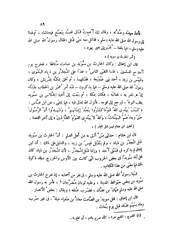 فَبَيْنَا رَسُولُ اللَّهِ صَلَّى اللهُ عَلَيْهِ وَسَلَّمَ، فِي نَفَرٍ مِنْ أَصْحَابِهِ، إذْ خَرَجَ الْحَارِثُ بْنُ سُوَيْدٍ مِنْ بَعْضِ حَوَائِطِ الْمَدِينَةِ، وَعَلَيْهِ ثَوْبَانِ مُضَرَّجَانِ [1] ، فَأَمَرَ بِهِ رَسُولُ اللَّهِ صَلَّى اللهُ عَلَيْهِ وَسَلَّمَ عُثْمَانَ بْنَ عَفَّانَ، فَضَرَبَ عُنُقَهُ، وَيُقَالُ: بَعْضُ الْأَنْصَارِ.