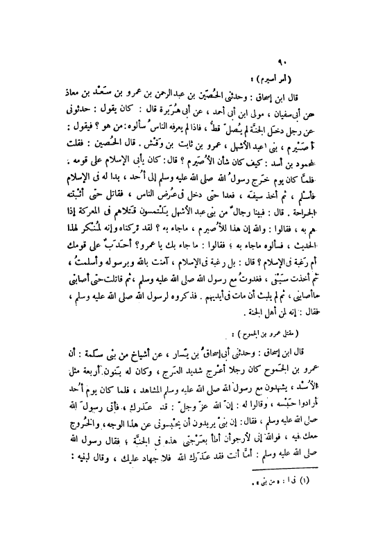 قَالَ ابْنُ إسْحَاقَ: وَحَدَّثَنِي أَبِي إسْحَاقُ بْنُ يَسَارٍ، عَنْ أَشْيَاخٍ مِنْ بَنِي سَلِمَةَ: أَنَّ عَمْرَو بْنَ الْجَمُوحِ كَانَ رَجُلًا أَعْرَجَ شَدِيدَ الْعَرَجِ، وَكَانَ لَهُ بَنُونَ أَرْبَعَةٌ مِثْلَ الْأُسْدِ، يَشْهَدُونَ مَعَ رَسُولِ اللَّهِ صَلَّى اللهُ عَلَيْهِ وَسَلَّمَ الْمَشَاهِدَ، فَلَمَّا كَانَ يَوْمُ أُحُدٍ أَرَادُوا حَبْسَهُ، وَقَالُوا لَهُ: إنَّ اللَّهَ عَزَّ وَجَلَّ: قَدْ عَذَرَكَ، فَأَتَى رَسُولَ اللَّهِ صَلَّى اللهُ عَلَيْهِ وَسَلَّمَ، فَقَالَ: إنَّ بَنِيَّ يُرِيدُونَ أَنْ يَحْبِسُونِي عَنْ هَذَا الْوَجْهِ، وَالْخُرُوجِ مَعَك فِيهِ، فو الله إنِّي لَأَرْجُو أَنْ أَطَأَ بِعَرْجَتِي هَذِهِ فِي الْجَنَّةِ، فَقَالَ رَسُولُ اللَّهِ صَلَّى اللهُ عَلَيْهِ وَسَلَّمَ: أَمَّا أَنْتَ فَقَدْ عَذَرَكَ اللَّهُ فَلَا جِهَادَ عَلَيْكَ، وَقَالَ لِبَنِيهِ: