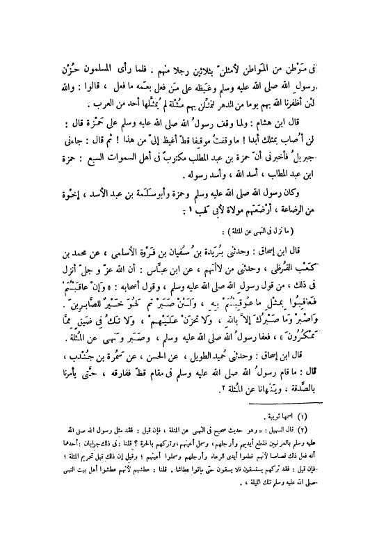 قَالَ ابْنُ إسْحَاقَ: وَحَدَّثَنِي بُرَيْدَةُ بْنُ سُفْيَانَ بْنِ فَرْوَةَ الْأَسْلَمِيُّ، عَنْ مُحَمَّدِ بْنِ كَعْبٍ الْقُرَظِيُّ، وَحَدَّثَنِي مَنْ لَا أَتَّهِمُ، عَنْ ابْنِ عَبَّاسٍ: أَنَّ اللَّهَ عَزَّ وَجَلَّ أَنْزَلَ فِي ذَلِكَ، مِنْ قَوْلِ رَسُولِ اللَّهِ صَلَّى اللهُ عَلَيْهِ وَسَلَّمَ، وَقَوْلِ أَصْحَابِهِ: «وَإِنْ عَاقَبْتُمْ فَعَاقِبُوا بِمِثْلِ مَا عُوقِبْتُمْ بِهِ، وَلَئِنْ صَبَرْتُمْ لَهُوَ خَيْرٌ لِلصَّابِرِينَ.