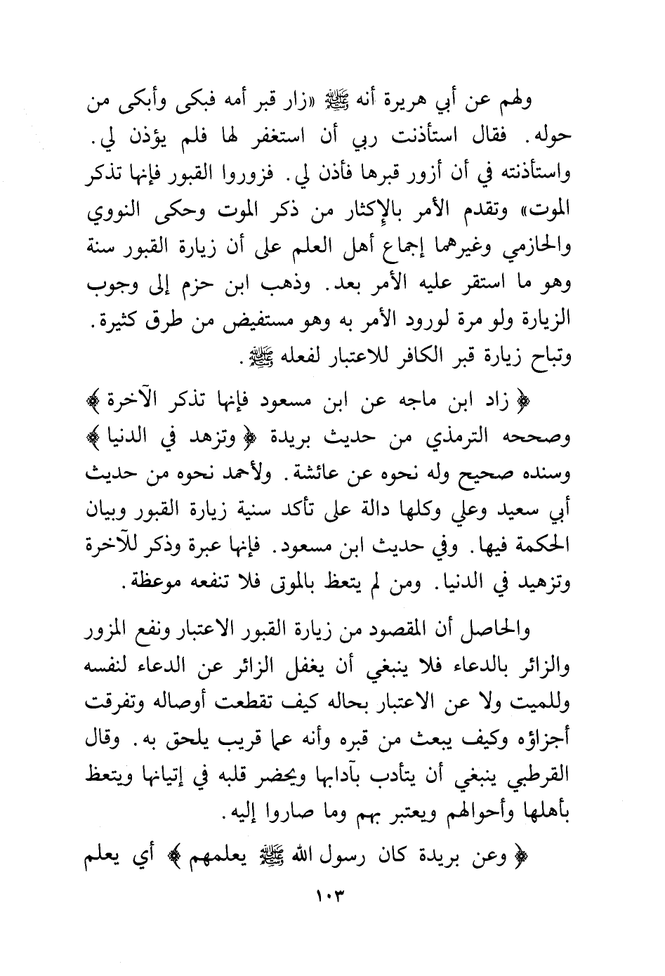 ولهم عن أبي هريرة أنه - صلى الله عليه وسلم - "زار قبر أمه فبكى وأبكى من حوله. فقال استأذنت ربي أن أستغفر لها فلم يؤذن لي. واستأذنته في أن أزور قبرها فأذن لي. فزوروا القبور فإنها تذكر الموت" وتقدم الأمر بالإكثار من ذكر الموت وحكى النووي والحازمي وغيرهما إجماع أهل العلم على أن زيارة القبور سنة وهو ما استقر عليه الأمر بعد. وذهب ابن حزم إلى وجوب الزيارة ولو مرة لورود الأمر به وهو مستفيض من طرق كثيرة وتباح زيارة قبر الكافر للاعتبار لفعله - صلى الله عليه وسلم -.