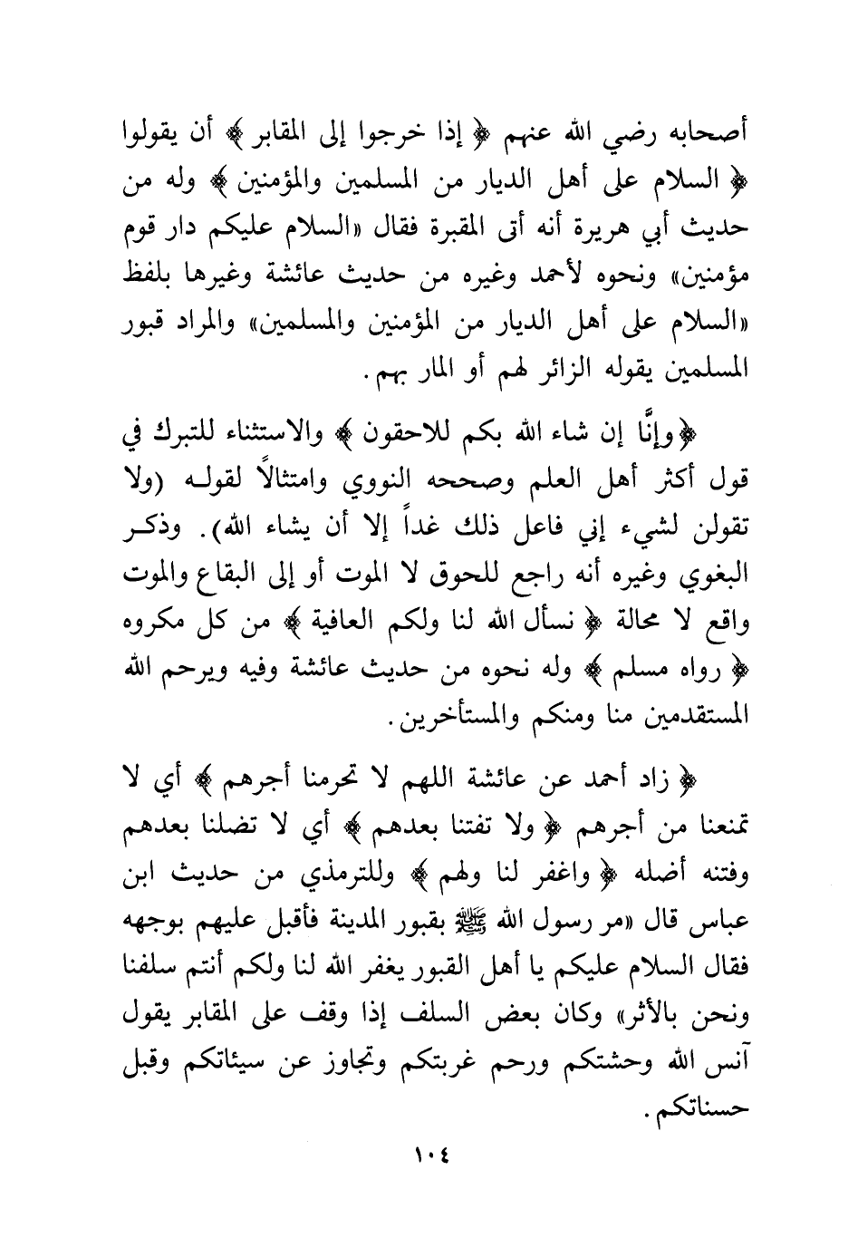 (وإنا إن شاء الله بكم للاحقون) والاستثناء للتبرك في قول أكثر أهل العلم وصححه النووي وامتثالا لقوله (ولا تقولن لشيء إني فاعل ذلك غدا إلا أن يشاء الله). وذكر البغوي وغيره أنه راجع للحوق لا الموت أو إلى البقاع والموت واقع لا محالة (نسأل الله لنا ولكن العافية) من كل مكروه (رواه مسلم) وله نحوه من حديث عائشة وفيه ويرحم الله المستقدمين منا ومنكم والمستأخرين.