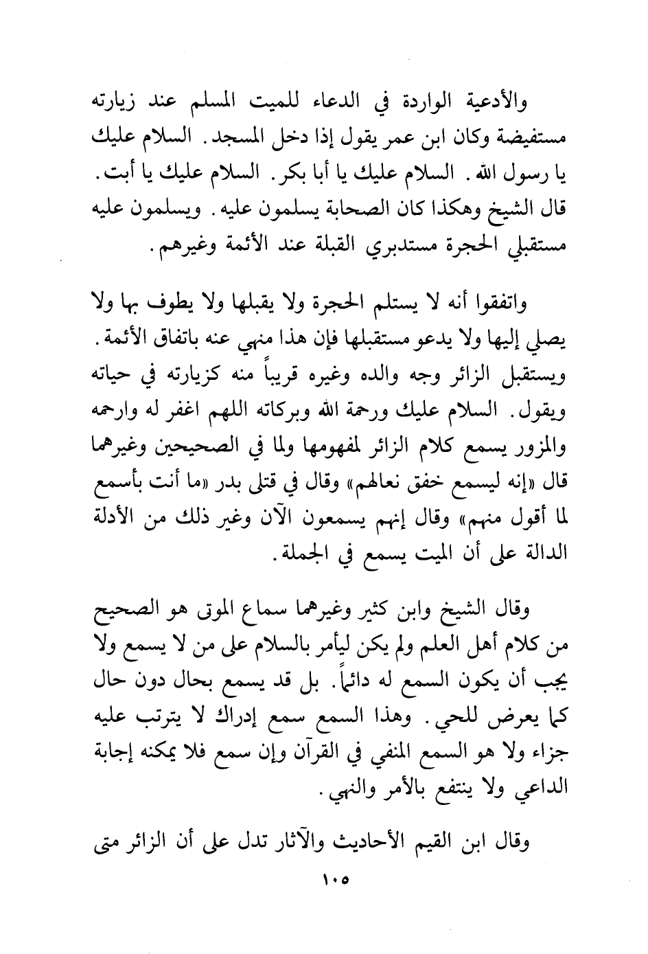 واتفقوا على أنه لا يستلم الحجرة ولا يقبلها ولا يطوف بها ولا يصلي إليها ولا يدعو مستقبلها فإن هذا منهي عنه باتفاق الأئمة. ويستقبل الزائر وجه والده وغيره قريبا منه كزيارته في حياته ويقول: السلام عليك ورحمة الله وبركاته اللهم اغفر له وارحمه والمزور يسمع كلام الزائر لمفهومها ولما في الصحيحين وغيرهما قال: "إنه ليسمع خفق نعالهم" وقال في قتلى بدر "ما أنت بأسمع لما أقول منهم" وقال إنهم يسمعون الآن وغير ذلك من الأدلة الدالة على أن الميت يسمع في الجملة.