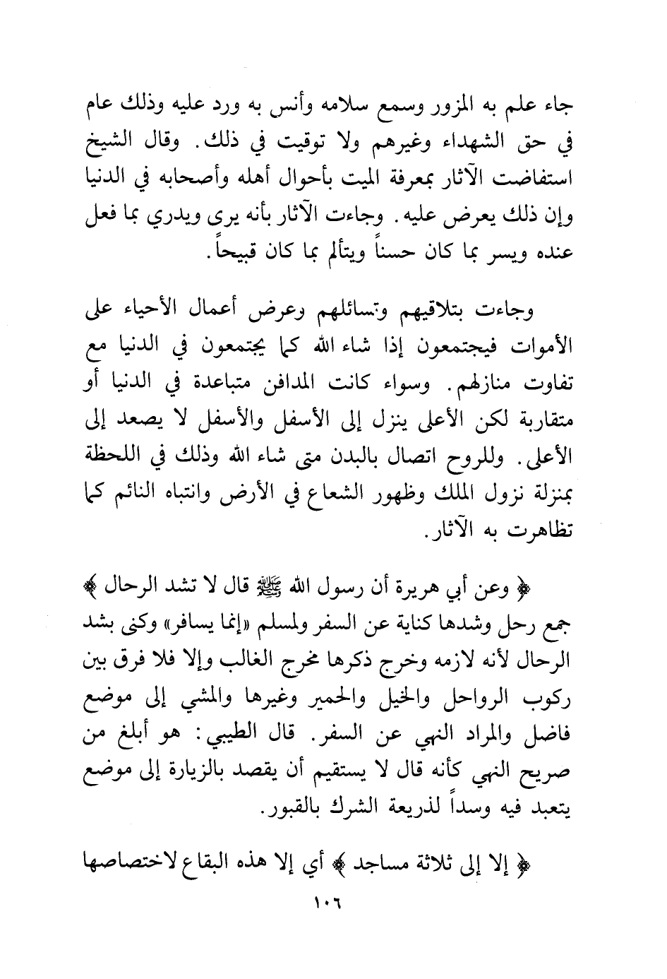 جاء علم به المزور وسمع سلامه وأنس به ورد عليه وذلك عام في حق الشهداء وغيرهم ولا توقيت في ذلك. وقال الشيخ استفاضت الآثار بمعرفة الميت بأحوال أهله وأصحابه في الدنيا وإن ذلك يعرض عليه. وجاءت الآثار بأنه يرى ويدري بما فعل عنده ويسر بما كان حسنا ويتألم بما كان قبيحا.