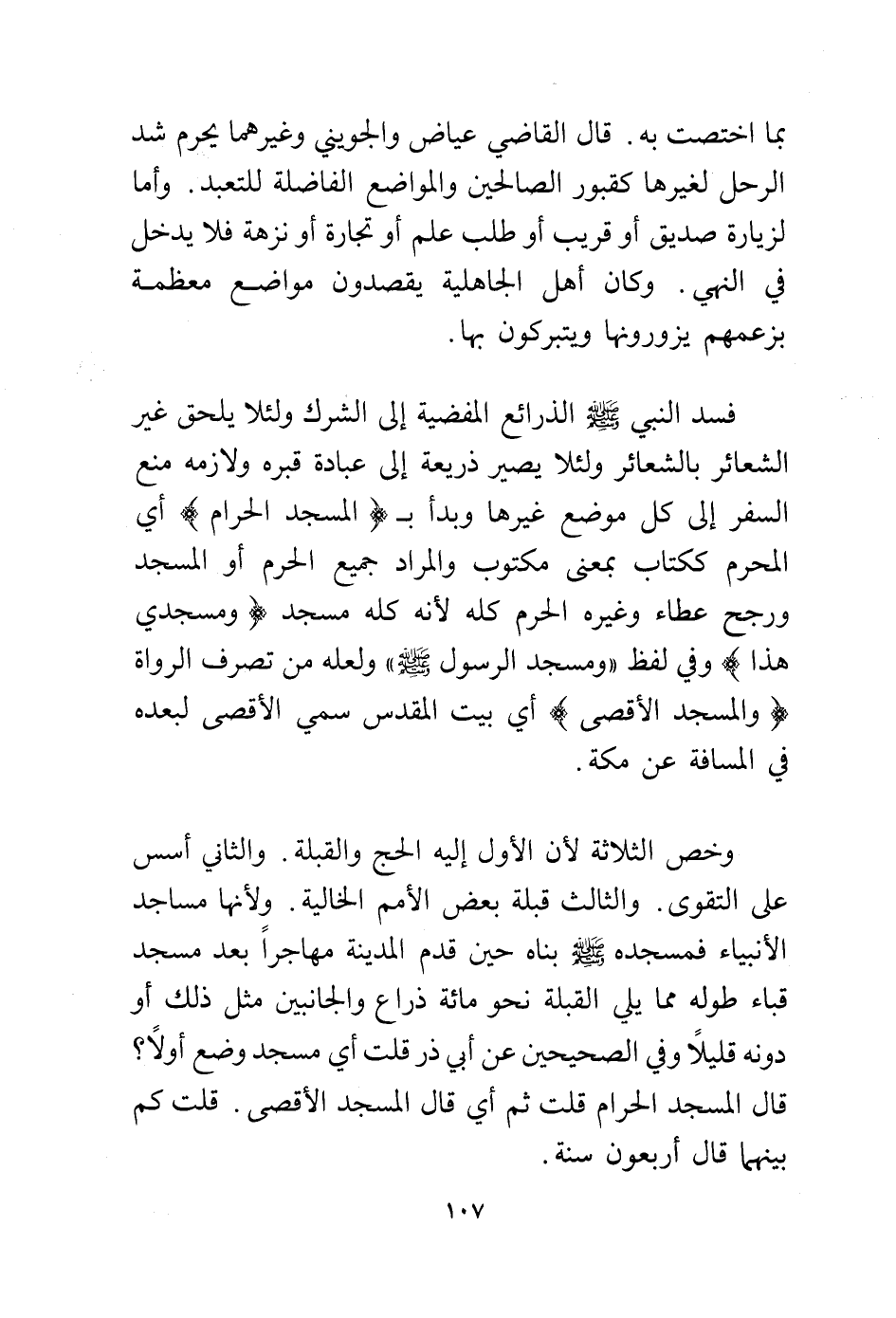 فسد النبي - صلى الله عليه وسلم - الذرائع المفضية إلى الشرك ولئلا يلحق غير الشعائر بالشعائر ولئلا يصير ذريعة إلى عبادة قبره ولازمه منع السفر إلى كل موضع غيرها وبدأ بـ (المسجد الحرام) أي المحرم ككتاب بمعنى مكتوب والمراد جميع الحرم أو المسجد ورجح عطاء وغيره الحرم كله لأنه كله مسجد (ومسجدي هذا) وفي لفظ "ومسجد الرسول - صلى الله عليه وسلم - " ولعله من تصرف الرواة (والمسجد الأقصى) أي بيت المقدس سمي الأقصى لبعده في المسافة عن مكة.