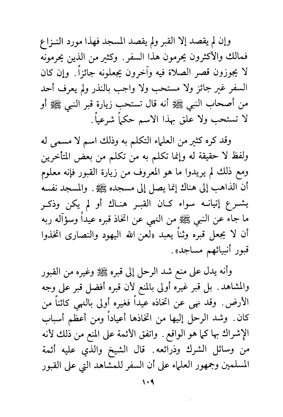 وقد كره كثير من العلماء التكلم به وذلك اسم لامسمى له ولفظ لا حقيقة له وإنما تكلم به من تكلم من بعض المتأخرين ومع ذلك لم يريدوا ما هو المعروف من زيارة القبور فإنه معلوم أن الذاهب إلى هناك إنما يصل إلى مسجده - صلى الله عليه وسلم -. والمسجد نفسه يشرع إتيانه سواء كان القبر هناك أو لم يكن وذكر ما جاء عن النبي - صلى الله عليه وسلم - من النهي عن اتخاذ قبره عيدا وسؤاله ربه أن لا يجعل قبره وثنا يعبد "لعن الله اليهود والنصارى اتخذوا قبور أنبيائهم مساجد".