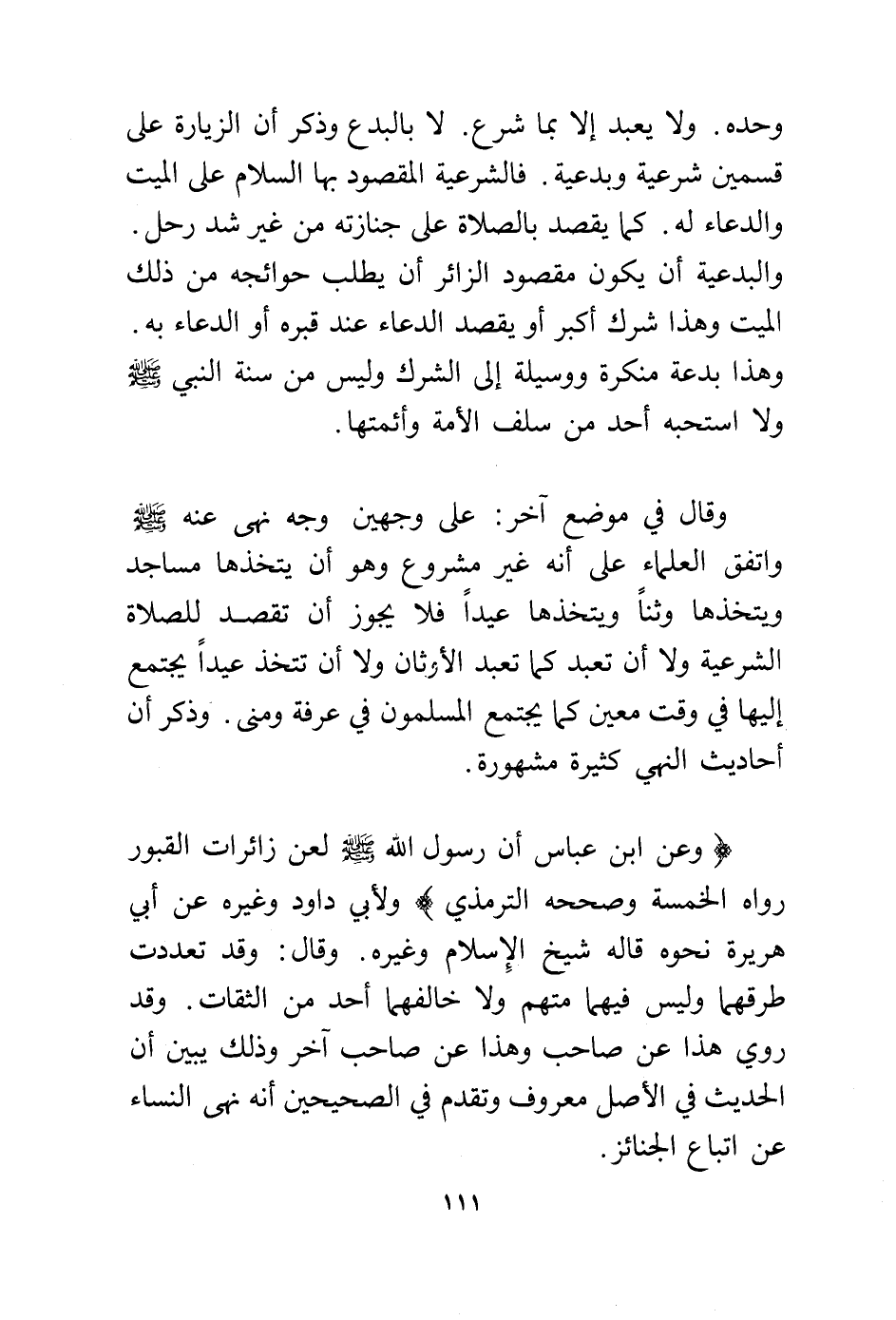 وحده. ولا يعبد إلا بما شرع. لا بالبدع وذكر أن الزيارة على قسمين شرعية وبدعية، فالشرعية المقصود بها السلام على الميت والدعاء له. كما يقصد بالصلاة على جنازته من غير شد رحل. والبدعية أن يكون المقصود الزائر أن يطلب حوائجه من ذلك الميت وهذا شرك أكبر أو يقصد الدعاء عند قبره أو الدعاء به. وهذه بدعة منكرة ووسيلة إلى الشرك وليس من سنة النبي - صلى الله عليه وسلم - ولا استحبه أحد من سلف الأمة وأئمتها.