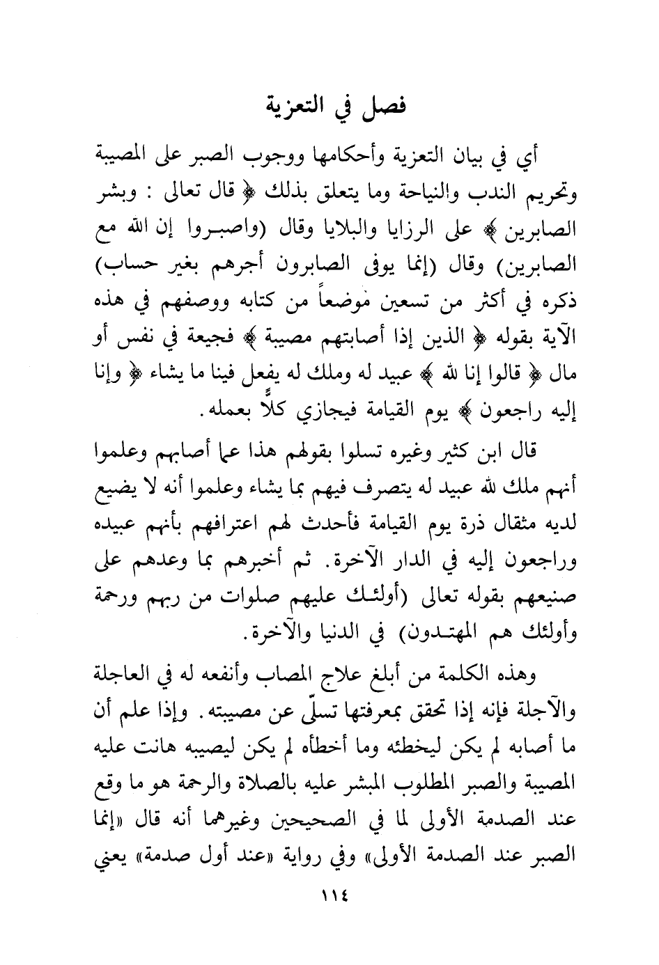 أي في بيان التعزية وأحكامها ووجوب الصبر على المصيبة وتحريم الندب والنياحة وما يتعلق بذلك قال تعالى: {وَبَشِّرِ الصَّابِرِينَ} على الرزايا والبلايا وقال: {وَاصْبِرُوا إِنَّ اللَّهَ مَعَ الصَّابِرِينَ} وقال: {إِنَّمَا يُوَفَّى الصَّابِرُونَ أَجْرَهُمْ بِغَيْرِ حِسَابٍ} ذكره في أكثر من تسعين موضعا من كتابه ووصفهم في هذه الآية بقوله {الَّذِينَ إِذَا أَصَابَتْهُمْ مُصِيبَةٌ} فجيعة في نفس أو مال {قَالُوا إِنَّا لِلَّهِ} عبيد له وملك له يفعل فينا ما يشاء {وَإِنَّا إِلَيْهِ رَاجِعُونَ} يوم القيامة فيجازي كلا بعمله.