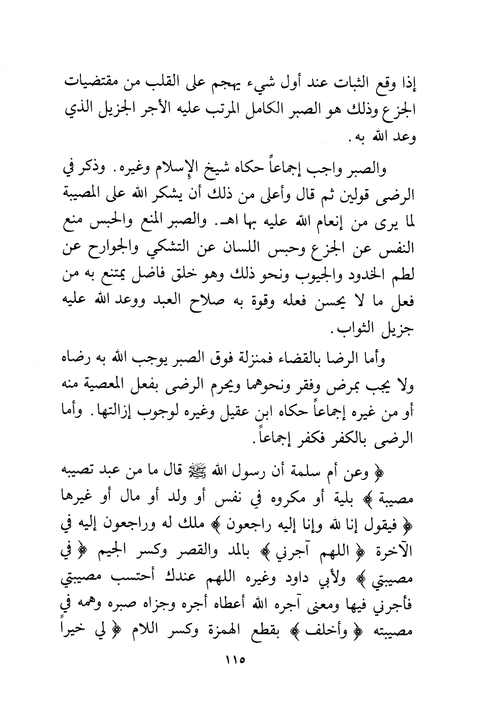والصبر واجب إجماعا حكاه شيخ الإسلام وغيره. وذكر في الرضى قولين ثم قال وأعلى من ذلك أن يشكر الله على المصيبة لما يرى من إنعام الله عليه بها اهـ. ـ. والصبر المنع والحبس منع النفس عن الجزع وحبس اللسان عن التشكي والجوارح عن لطم الخدود والجيوب ونحو ذلك وهو خلق فاضل يمتنع به من فعل ما لا يحسن فعله وقوة به صلاح العبد ووعد الله عليه جزيل الثواب.