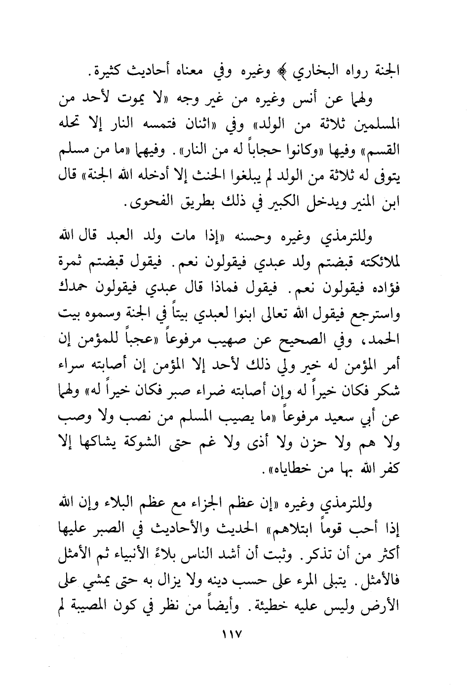 وللترمذي وغيره وحسنه "إذا مات ولد العبد قال الله لملائكته قبضتم ولد عبدي فيقولون نعم. فيقول قبضتم ثمرة فؤاده فيقولون نعم. فيقول فماذا قال عبدي فيقولون حمدك واسترجع فيقول الله تعالى ابنوا لعبدي بيتا في الجنة وسموه بيت الحمد، وفي الصحيح عن صهيب مرفوعا "عجبا للمؤمن إن أمر المؤمن له خير ولي ذلك لأحد إلا المؤمن إن أصابته سراء شكر فكان خيرا له وإن أصابته ضراء صبر فكان خيرا له" ولهما عن أبي سعيد مرفوعا "ما يصيب المسلم من نصب ولا وصب ولا هم ولا حزن ولا أذى ولا غم حتى الشوكة يشاكها إلا كفر الله بها من خطاياه".