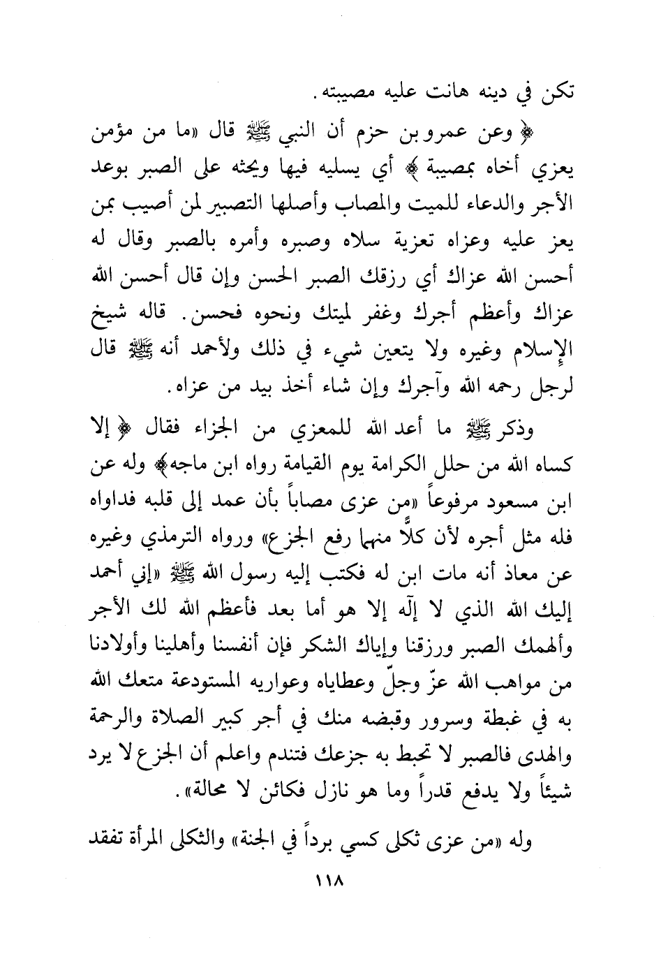 وذكر - صلى الله عليه وسلم - ما أعد الله للمعزي من الجزاء فقال: (إلا كساه الله من حلل الكرامة يوم القيامة رواه ابن ماجه) وله عن ابن مسعود مرفوعا "من عزى مصابا بأن عمد إلى قلبه فداواه فله مثل أجره لأن كلا منهما رفع الجزع" ورواه الترمذي وغيره عن معاذ أنه مات ابن له فكتب إليه رسول الله - صلى الله عليه وسلم - "إني أحمد إليك الله الذي لا إله إلا هو أما بعد فأعظم الله لك الأجر وألهمك الصبر ورزقنا وإياك الشكر فإن أنفسنا وأهلينا وأولادنا من مواهب الله عز وجل وعطاياه وعواريه المستودعة متعك الله به في غبطة وسرور وقبضه منك في أجر كبير الصلاة والرحمة والهدى فالصبر لا تحبط به جزعك فتندم واعلم ان الجزع لا يرد شيئًا ولا يدفع قدرًا وما هو نازل فكائن لا محالة".