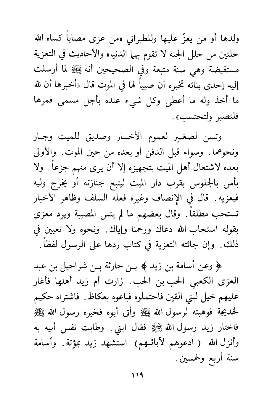 ولدها أو من يعز عليها وللطبراني "من عزى مصابًا كساه الله حلتين من حلل الجنة لا تقوم بهما الدنيا" والأحاديث في التعزية مستفيضة وهي سنة متبعة وفي الصحيحين أنه - صلى الله عليه وسلم - لما أرسلت إليه إحدى بناته تخبره أن صبيا لها في الموت قال "أخبرها أن لله ما أخذ وله ما أعطى وكل شيء عنده بأجل مسمى فمرها فلتصبر ولتحتسب".