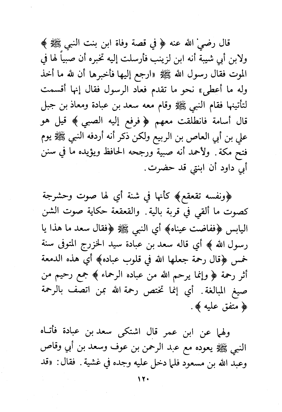 قال رضي الله عنه (في قصة وفاة ابن بنت النبي - صلى الله عليه وسلم -) ولابن أبي شيبة أنه ابن لزينب فأرسلت إليه تخبره أن صبيا لها في الموت فقال رسول الله - صلى الله عليه وسلم -: "ارجع إليها فأخبرها أن الله ما أخذ وله ما أعطى" نحو ما تقدم فعاد الرسول فقال إنها أقسمت لتأتينها فقام النبي - صلى الله عليه وسلم - وقام معه سعد بن عبادة ومعاذ بن جبل قال أسامة فانطلقت معهم (فرفع إليه الصبي) قيل هو علي بن أبي العاص بن الربيع ولكن ذكر أنه أردفه النبي - صلى الله عليه وسلم - يوم فتح مكة. ولأحمد أنه صبية ورجحه الحافظ ويؤيده ما في سنن أبي داود أن ابنتي قد حضرت.