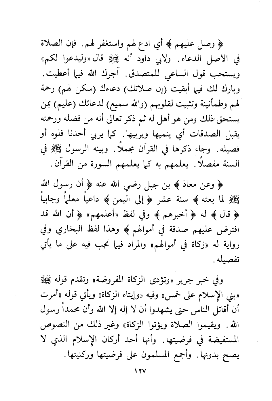 (وعن معاذ) ابن جبل رضي الله عنه (أن رسول الله - صلى الله عليه وسلم - لما بعثه) سنة عشر (إلى اليمن) داعيا معلما وجابيا (قال) له (أخبرهم) وفي لفظ "أعلمهم" (أن الله قد افترض عليهم صدقة في أموالهم) وهذا لفظ البخاري وفي رواية له "زكاة في أموالهم" والمراد فيما تجب فيه على ما يأتي تفصيله.