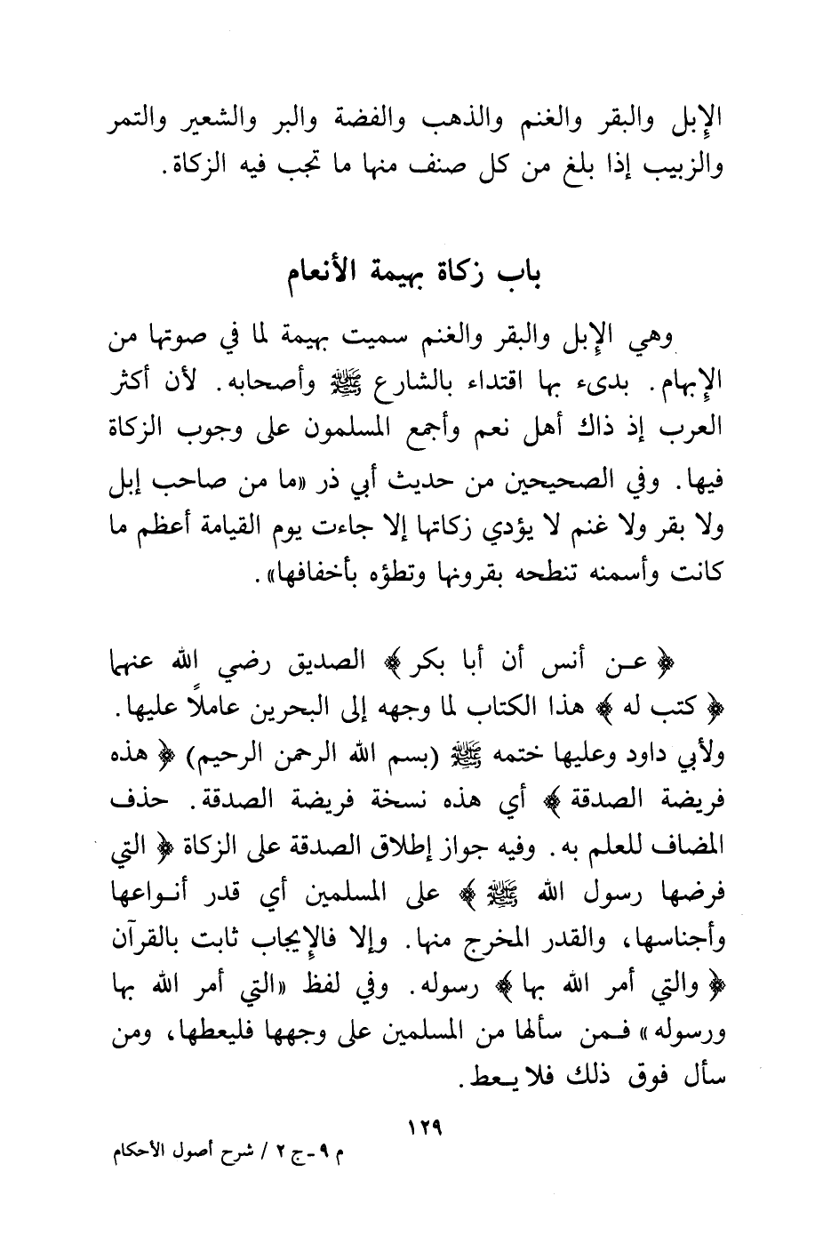 وهي الإبل والبقر والغنم سميت بهيمة لما في صوتها من الإبهام. بدئ بها اقتداء بالشارع - صلى الله عليه وسلم - وأصحابه. لأن أكثر العرب إذ ذاك أهل نعم وأجمع المسلمون على وجوب الزكاة فيها. وفي الصحيحين من حديث أبي ذر "ما من صاحب إبل ولا بقر ولا غنم لا يؤدي زكاتها إلا جاءت يوم القيامة أعظم ما كانت أسمته تنطحه بقرونها وتطؤه بأخفافها".