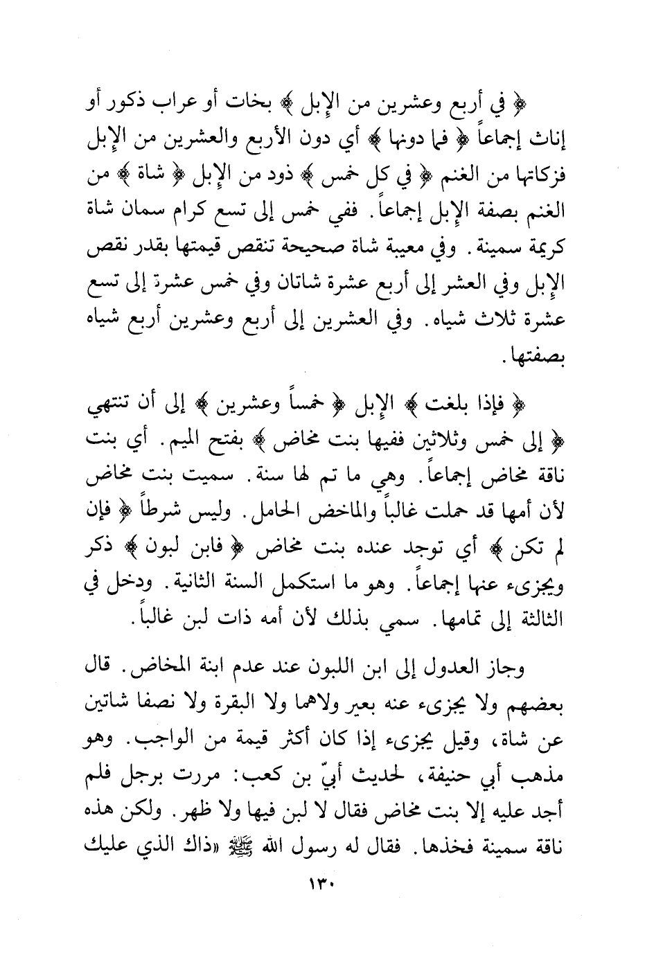 (فإذا بلغت) الإبل (خمسا وعشرين) إلى أن تنتهي (إلى خمس وثلاثين ففيها بنت مخاض) بفتح الميم. أي بنت ناقة مخاض إجماعًا. وهي ما تم لها سنة. سميت بنت مخاض لأن أمها قد حملت غالبًا والماخض الحامل. وليس شرطا (فأن لم تكن) أي توجد عنده بنت مخاض (فإبن لبون) ذكر ويجزئ عنها إجماعًا. وهو ما استكمل السنة الثانية. ودخل في الثالثة إلى تمامها. سمي بذلك لأن أمه ذات لبن غالبًا.