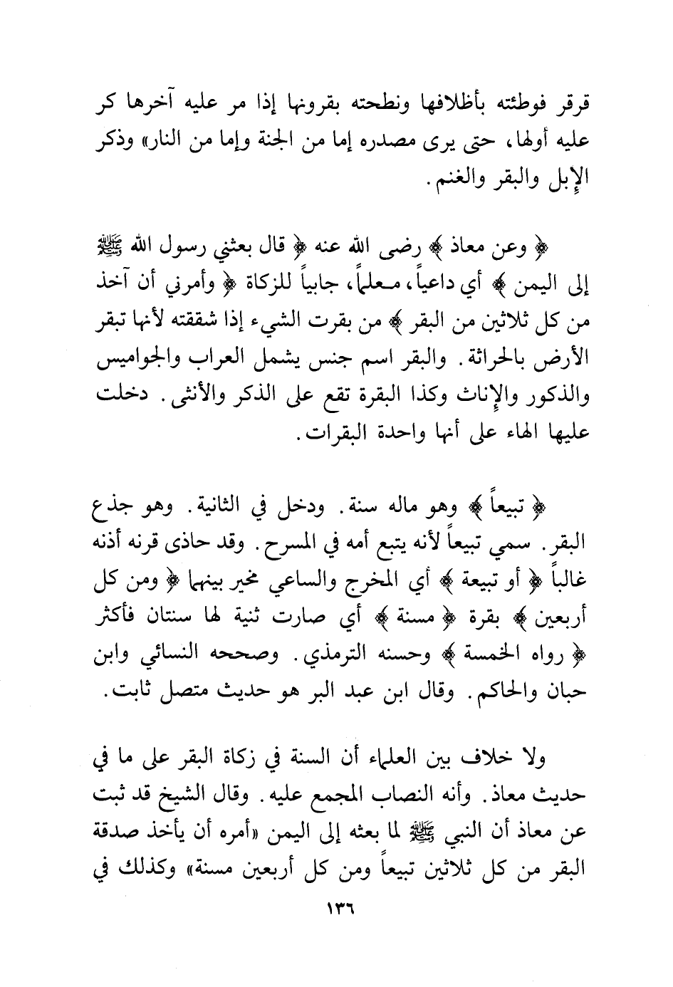 (تبيعا) وهو ماله سنة. ودخل في الثانية. وهو جذع البقر. سمي تبيعا لأنه يتبع أمه في المسرح. وقد حاذى قرنه أذنه غالبا (أو تبيعة) أي المخرج والساعي مخير بينهما (ومن كل أربعين) بقرة (مسنة) أي صارت ثنية لها سنتان فأكثر (رواه الخمسة) وحسنه الترمذي. وصححه النسائي وابن حبان والحاكم. وقال ابن عبد البر هو حديث متصل ثابت.