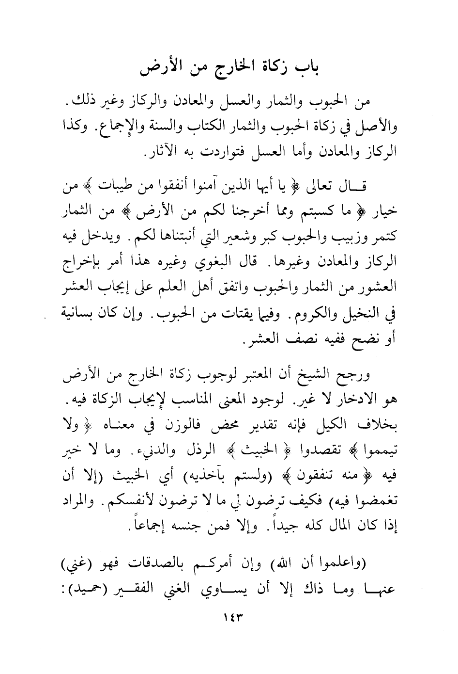 قال تعالى: {يَا أَيُّهَا الَّذِينَ آمَنُوا أَنْفِقُوا مِنْ طَيِّبَاتِ} من خيار {مَا كَسَبْتُمْ وَمِمَّا أَخْرَجْنَا لَكُمْ مِنَ الْأَرْضِ} من الثمار كتمر وزيبب والحبوب كبر وشعير التي أنبتناها لكم. ويدخل فيه الركاز والمعادن وغيرها. قال البغوي وغيره هذا أمر بإخراج العشور من الثمار والحبوب واتفق أهل اعلم على إيجاب العشر في النخيل والكروم. وفيما يقتات من الحبوب. إن كان بسانية أو نضح ففيه نصف العشر.