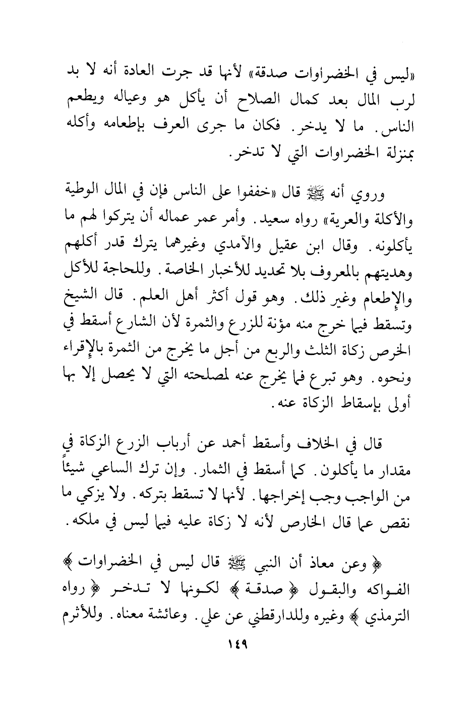 وروي أنه - صلى الله عليه وسلم - قال: "خففوا على الناس فإن في المال الوطية والأكلة والعربة" رواه سعيد. وأمر عمر عماله أن يتركوا لهم ما يأكلونه. وقال ابن عقيل والآمدي وغيرهما يترك قدر أكلهم وهديتهم بالمعروف بلا تحديد للأخبار الخاصة. وللحاجة للأكل والإطعام وغير ذلك. وهو قول أكثر أهل العلم. قال الشيخ وتسقط فيما خرج منه مؤنة للزرع والثمرة لأن الشارع أسقط في الخرص زكاة الثلث والربع من أجل ما يخرج من الثمرة بالإقراء ونحوه. وهو تبرع فما يخرج عنه لمصلحته التي لا يحصل إلا بها أولى بإسقاط الزكاة عنه.