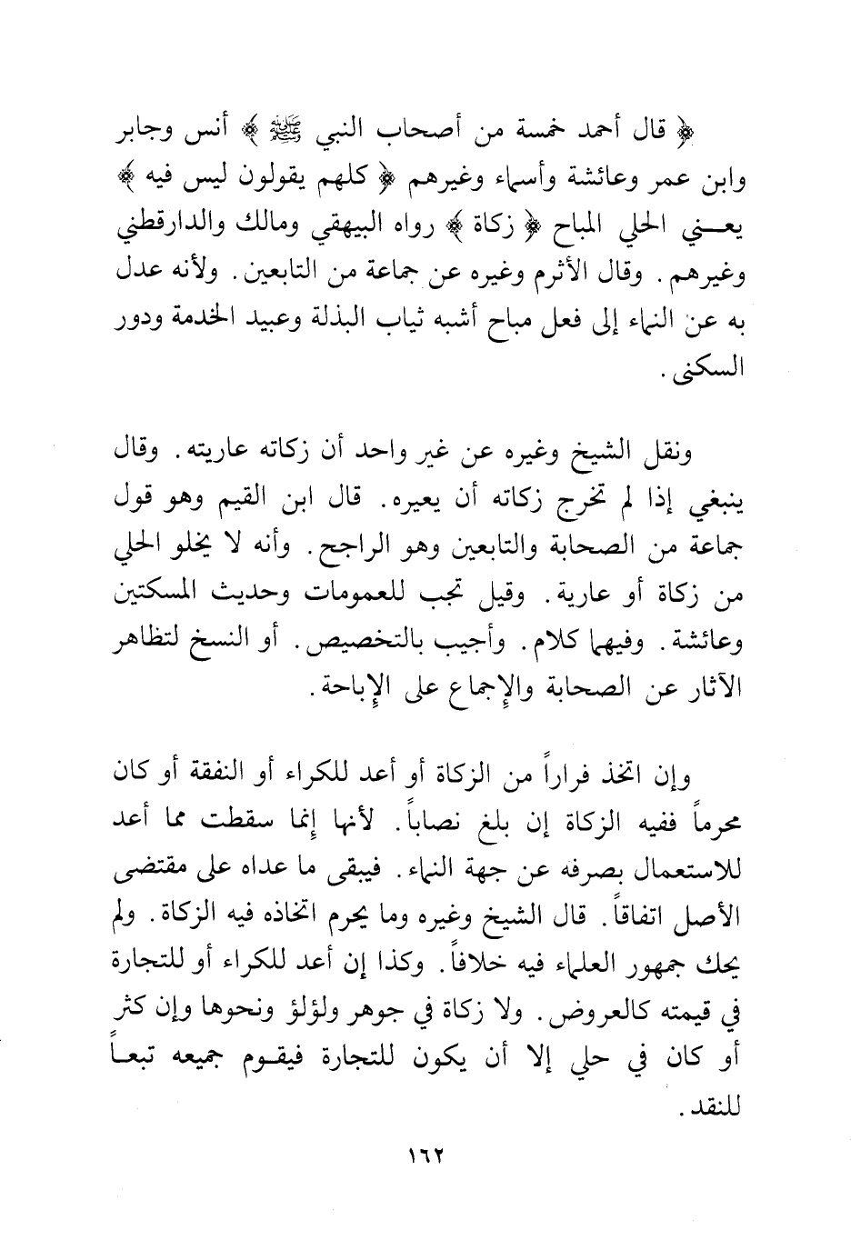 (قال أحمد خمسة من أصحاب النبي - صلى الله عليه وسلم -) أنس وجابر وابن عمر وعائشة وأسماء غيرهم (كلهم يقولون ليس فيه) يعني الحلي المباح (زكاة) رواه البيهقي ومالك والدارقطني وغيرهم. وقال الأثرم وغيره عن جماعة من التابعين. ولأنه عدل به عن النماء إلى فعل المباح أشبه ثياب البذلة وعبيد الخدمة ودور السكنى.
